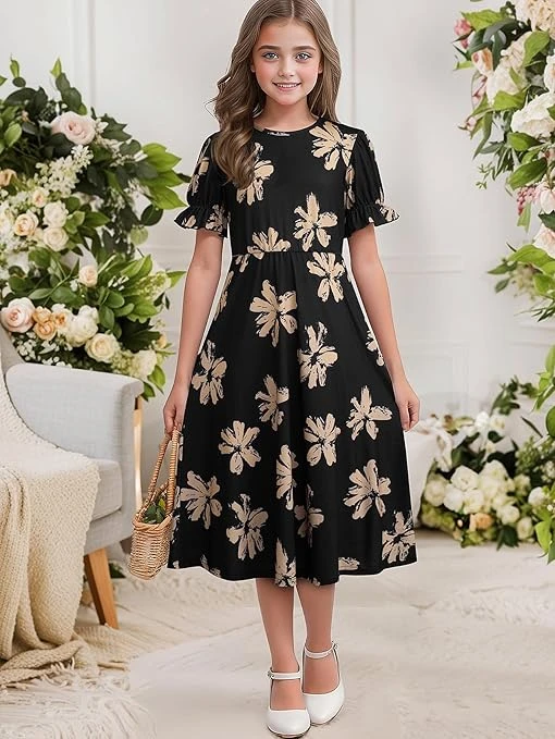 فساتين للبنات برقبة دائرية ضيقة وأكمام قصيرة منفوخة بطبعة زهور للعطلات والصيف كاجوال متوسطة الطول من 11-14 سنة