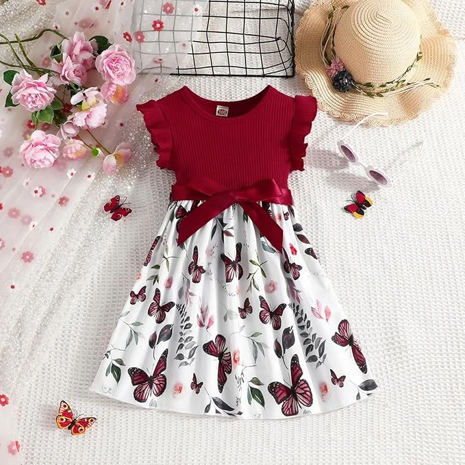 فستان باكمام رفرفة للاطفال مع بلوزة حمراء وفيونكة، تنورة بنمط فراشة وزهور، زي لل