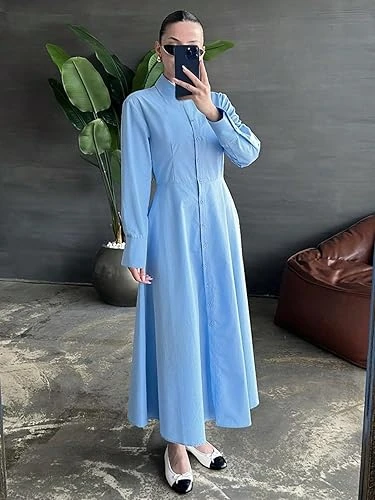 فستان كلاسيكي بتصميم قميص للنساء - فستان ماكسي بأكمام طويلة مع زر أمامي وتصميم ي