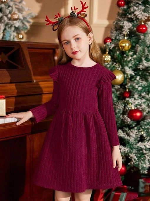 فستان للبنات بأكمام طويلة وقبة دائرية مزخرف بالكشكشة ومصنوع من قماش محبوك بقصة ا