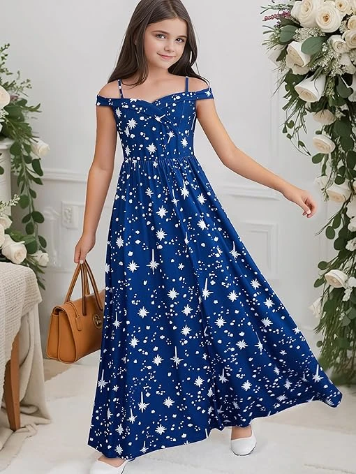 فستان ماكسي كاجوال طويل ومكشوف الكتفين بطبعة جرافيك وقصة ايه-لاين منسدلة، مناسب لحفلات الأعياد وأعياد الميلاد للبنات بعمر 9 إلى 14 سنة