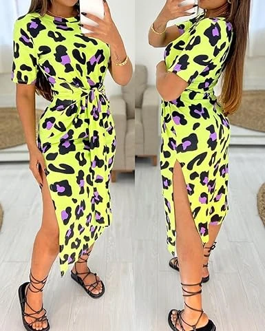 فستان متوسط الطول بطبعة جلد الفهد للنساء مع ربطة خصر وقبة دائرية وأكمام قصيرة فس