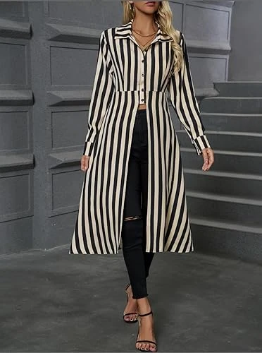 فستان نسائي طويل مخطط بخطوط عمودية وياقة بازرار امامية متعدد الاستخدامات للارتدا