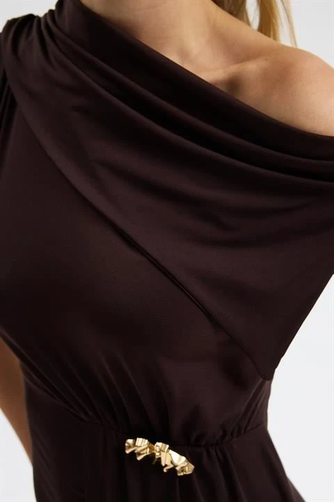 فستان سهرة بني بقصة كتف واحد مع لمسة ذهبية
