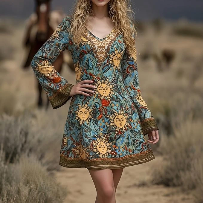 فستان شتوي باكمام طويلة وطبعة عرقية بنمط ريفي للنساء