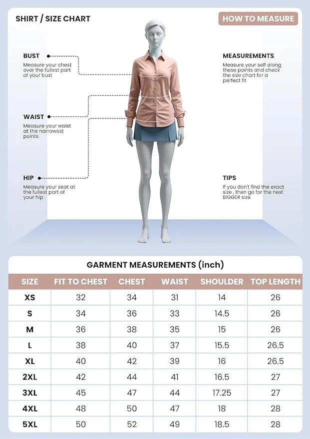 • توصية المقاس: يرجى استخدام دليل مقاسات الرسم البياني لتحديد المقاس المثالي لقمصان النساء؛ يوصى باختيار مقاس كبير للحصول على مقاس مريح.