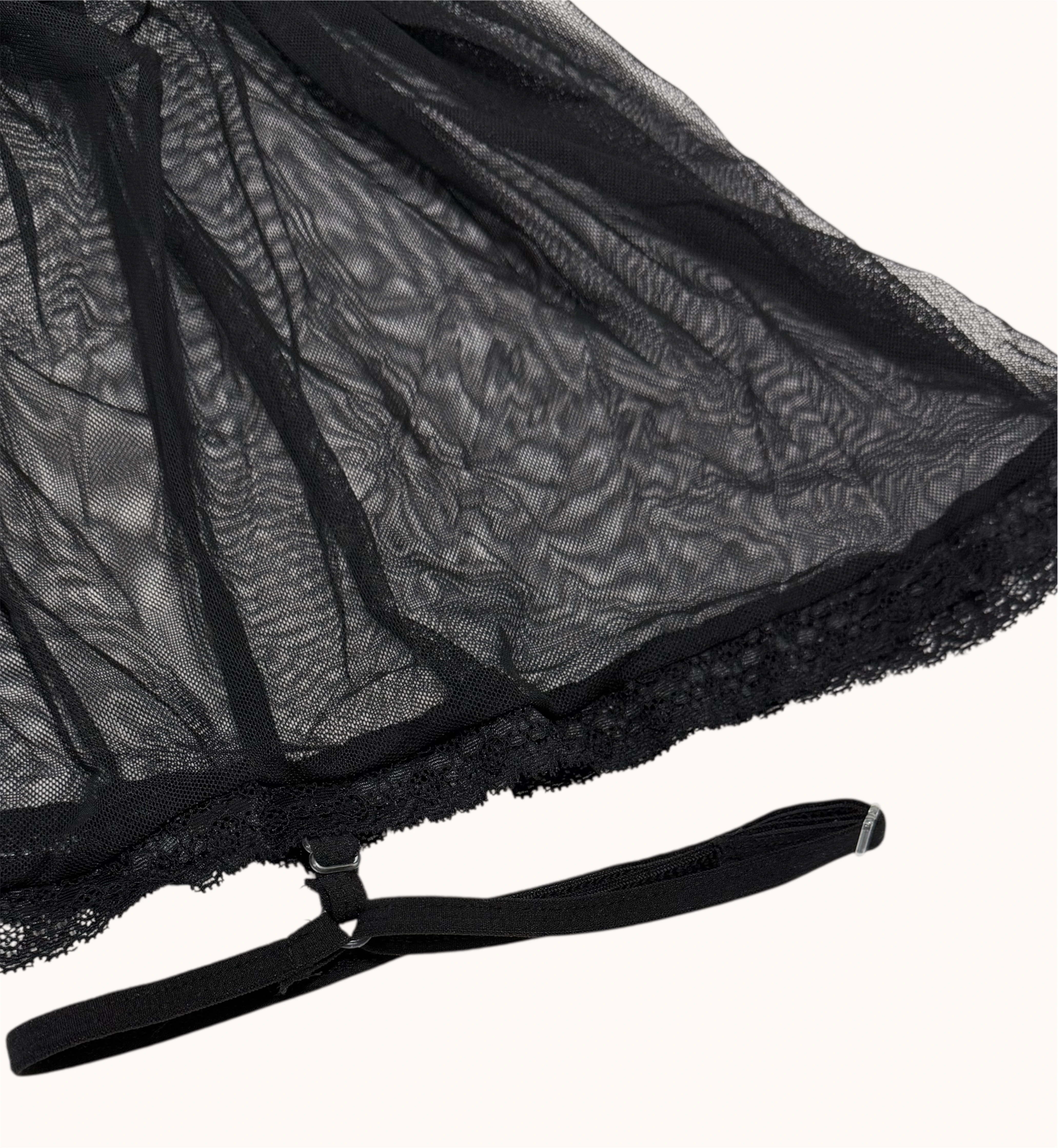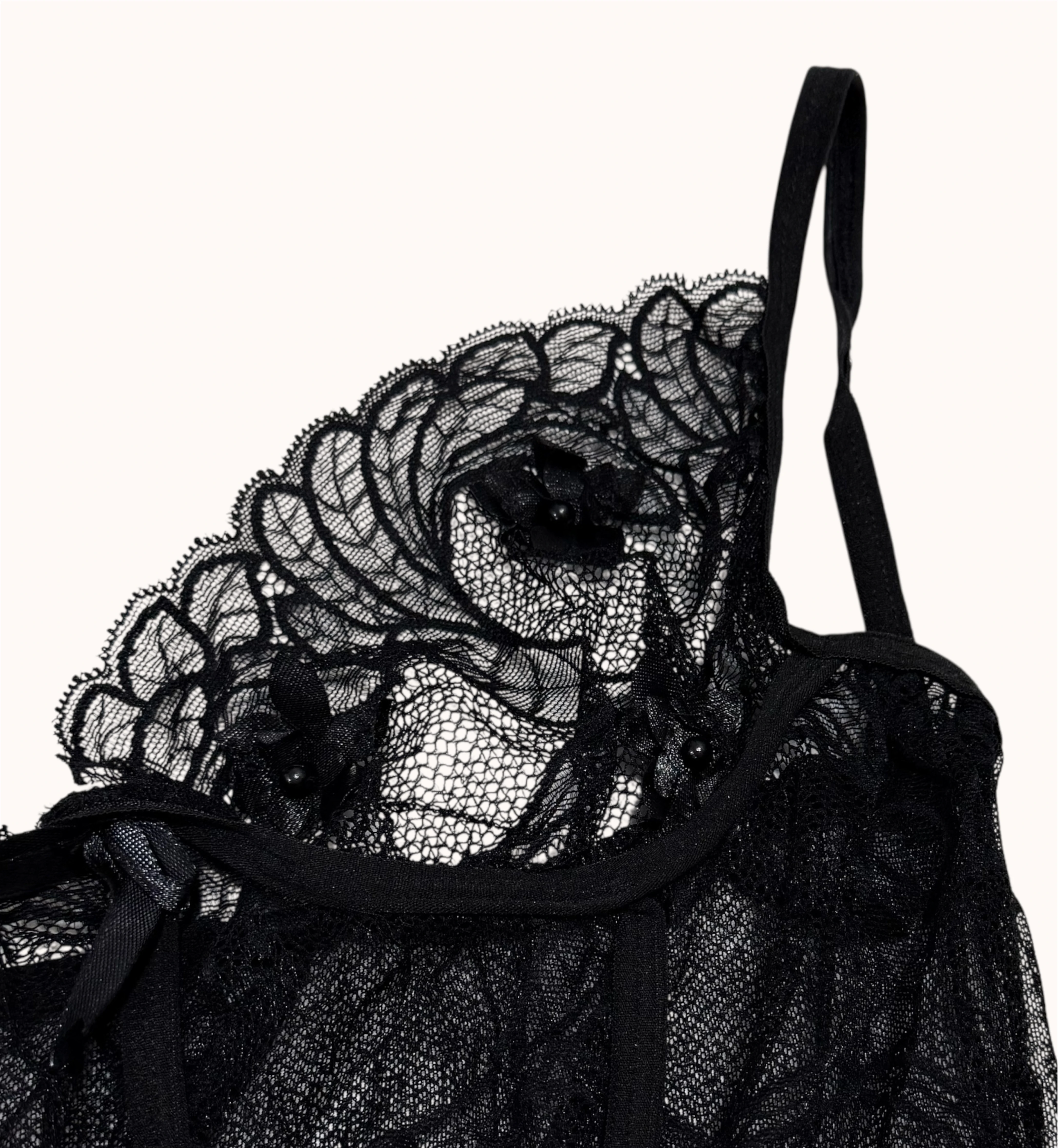 مزود بأربطة جانبية قابلة للتوصيل بالجوارب (Garter Straps)، وسروال داخلي متناسق بتصميم بسيط.