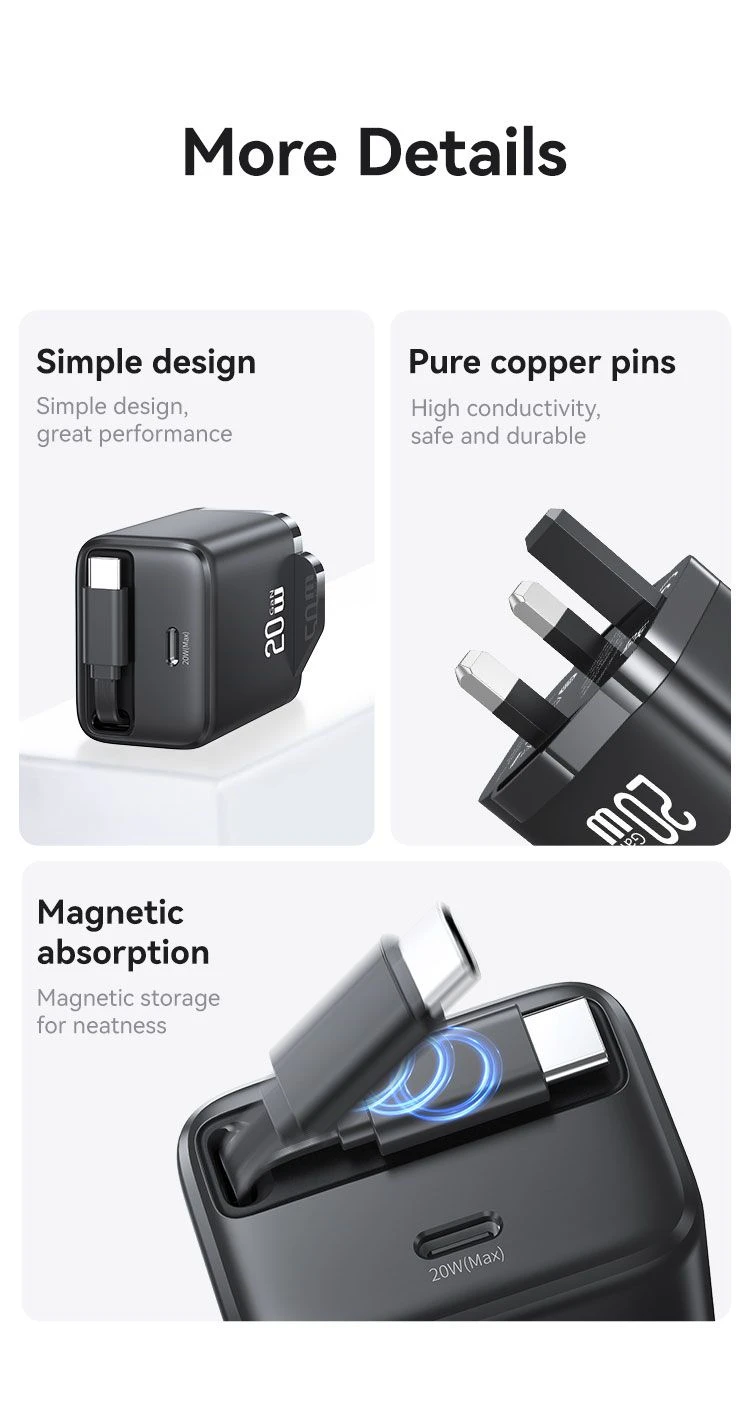 يأتي الشاحن بتصميم مدمج وعصري، مزود بكابل Type-C قابل للسحب بطول يصل إلى 80 سم،