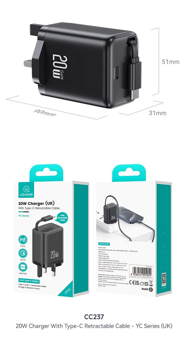 🔌 شاحن USAMS 20W مع كابل Type-C قابل للسحب – إصدار المملكة المتحدة (YC Series)