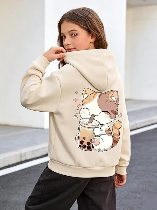 سويت شيرت بغطاء للرأس للبنات، بلوفر من الصوف الناعم بأكمام طويلة مع طباعة قطة لط