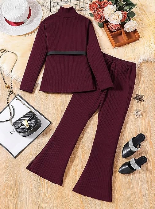 طقم ملابس مضلع منسوج للبنات مكون من بلوزة بأكمام طويلة وقبة دائرية وسروال واسع،
