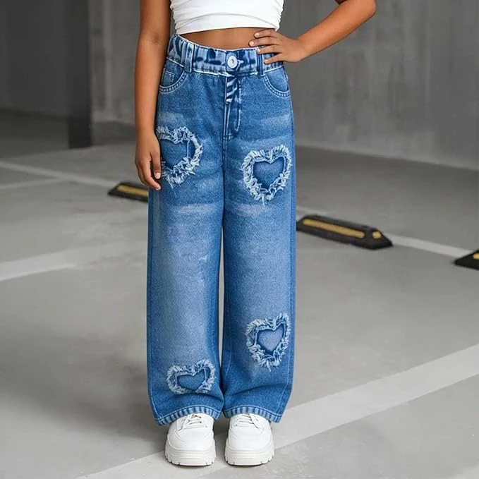 سروال كابري بأرجل واسعة للبنات من الجينز سهل الارتداء بخصر مطاطي وفتحات على شكل قلب، سروال جينز قصير مناسب للمدرسة