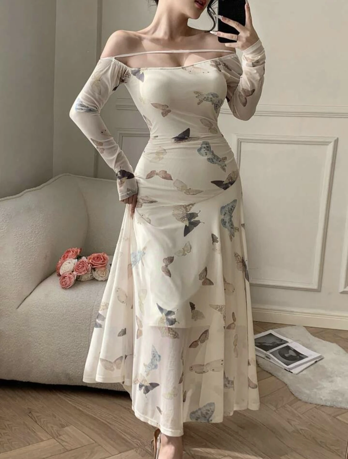 فستان ليوبارد بفتحة مربعة – أكمام شفافة