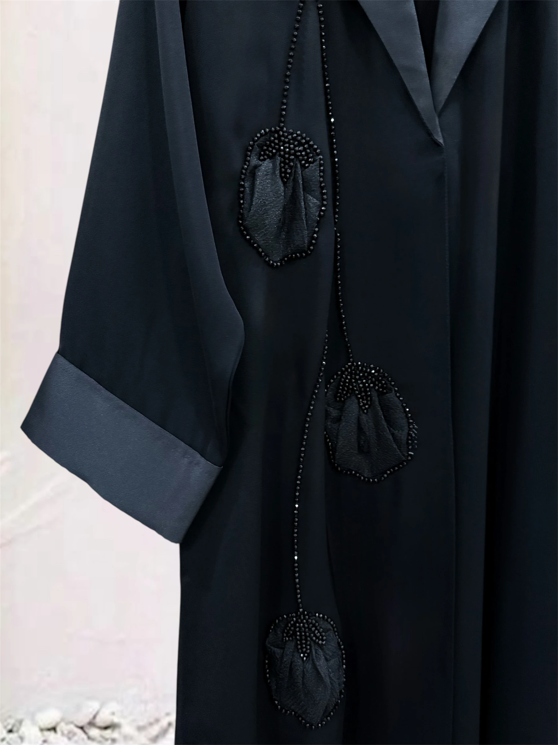 فتمنح العباية طابعًا فريدًا من الأناقة الهادئة، وتكسر اللون الأسود بأسلوب أنثوي جذاب.