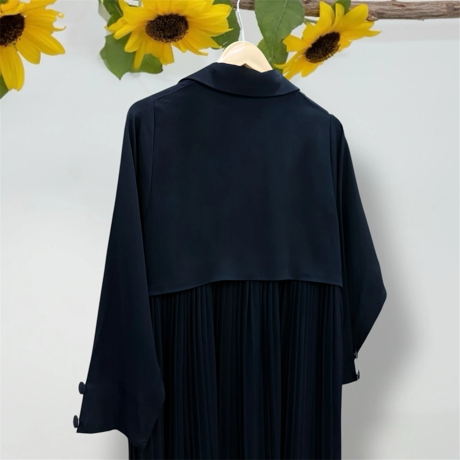 مع تفاصيل أنيقة تعكس بساطتها وفخامتها. الأكمام الطويلة تستمر بتصميمها المتناسق،