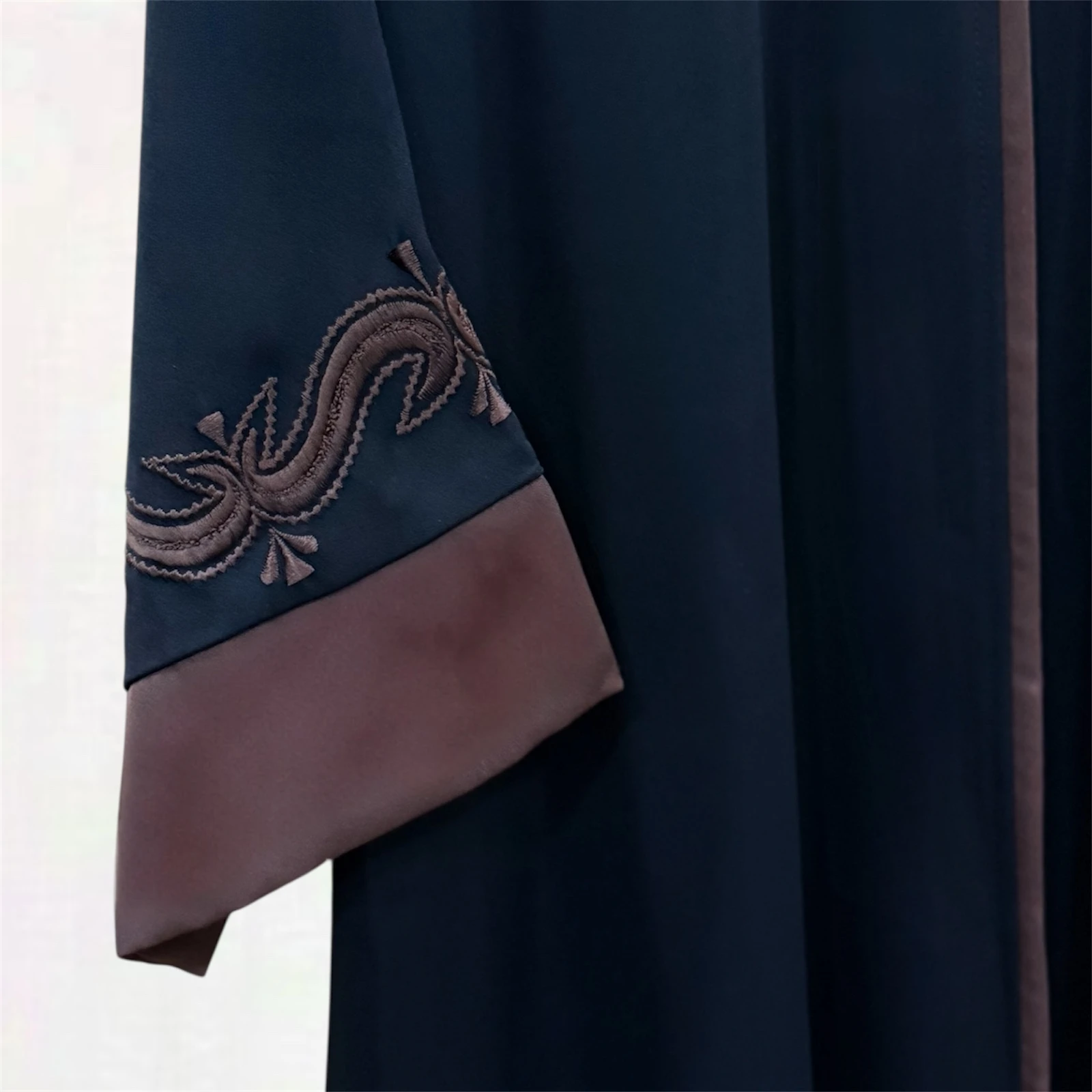 تتجلى العباية بلون أسود أنيق مع تطريز بني ناعم على الأكمام والحواف،