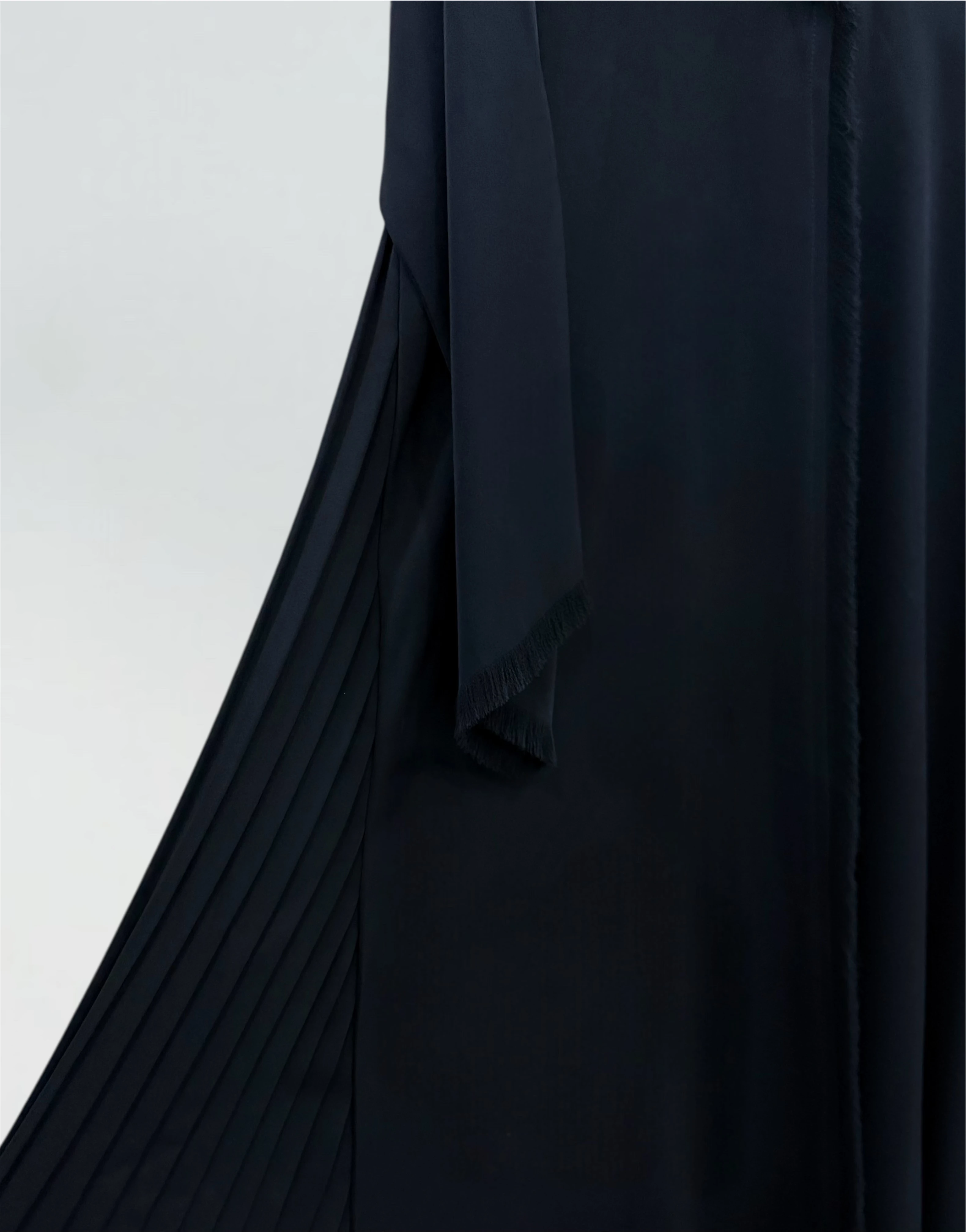 - **التفاصيل الجانبية:** تحتوي العباية على **كسرات جانبية**