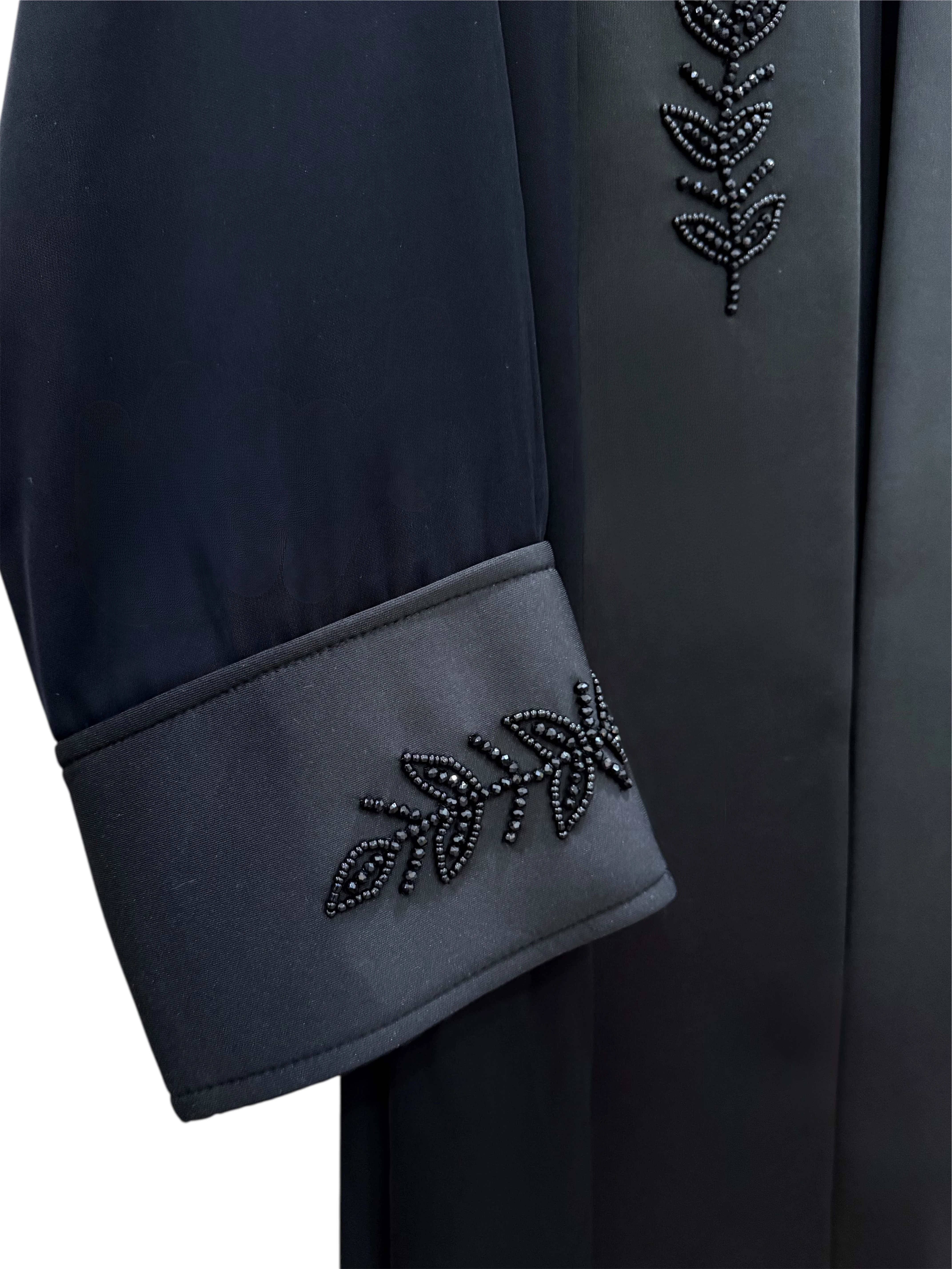 تتزين العباية بتطريزات دقيقة على الألواح الأمامية والأكمام،