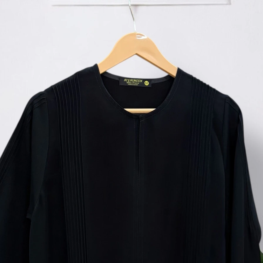 تأتي العباية مع طرحة سوداء بسيطة لإكمال الإطلالة بأسلوب أنيق وعملي،