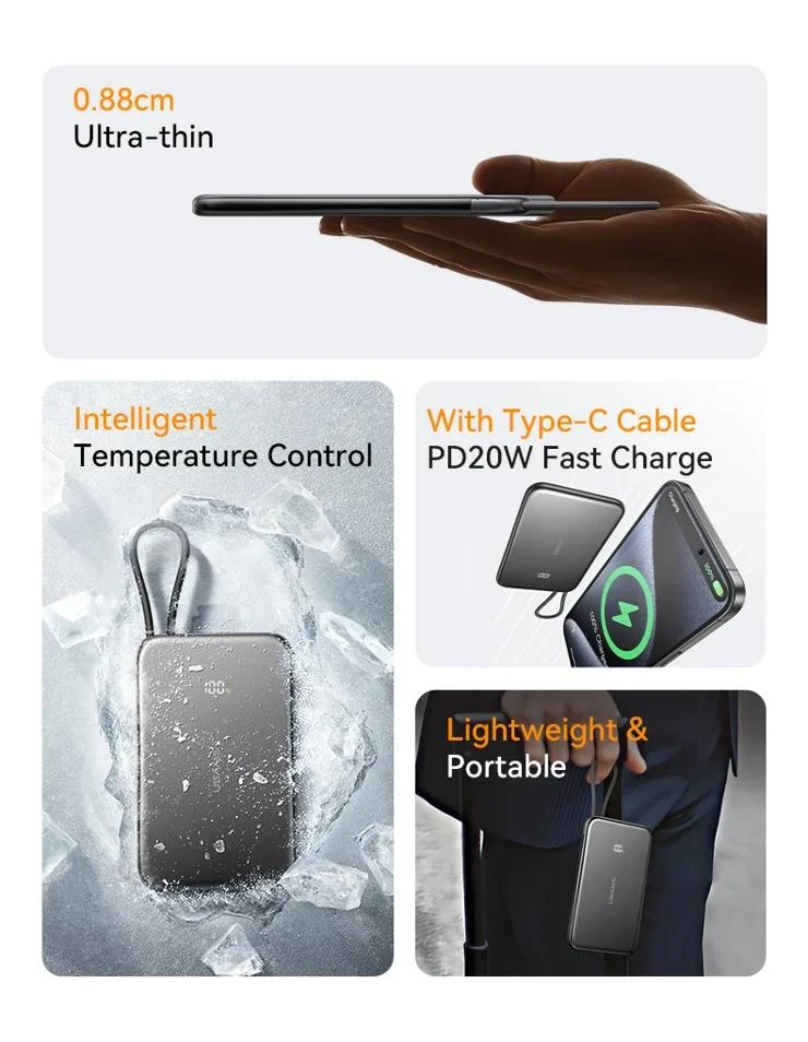 - تصميم فائق النحافة: بسُمك 0.88 سم فقط، سهل الحمل والدمج مع الهاتف.