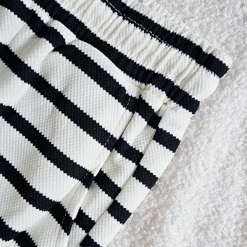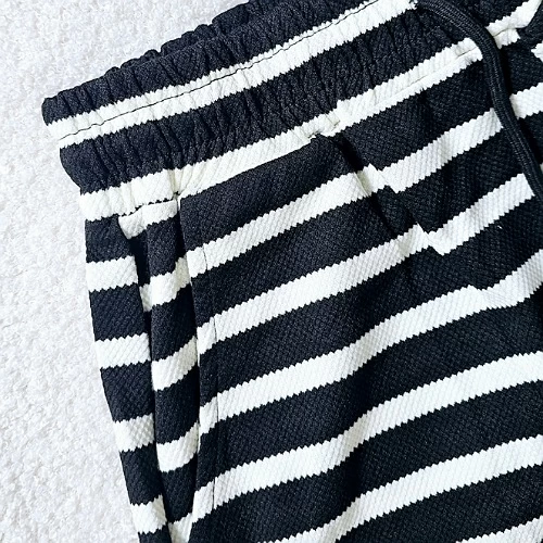 مكونه من قطعتين بلوزه وبنطلون بتصميم مخطط عرضي لاضافه لمسه انيقه وعصريه