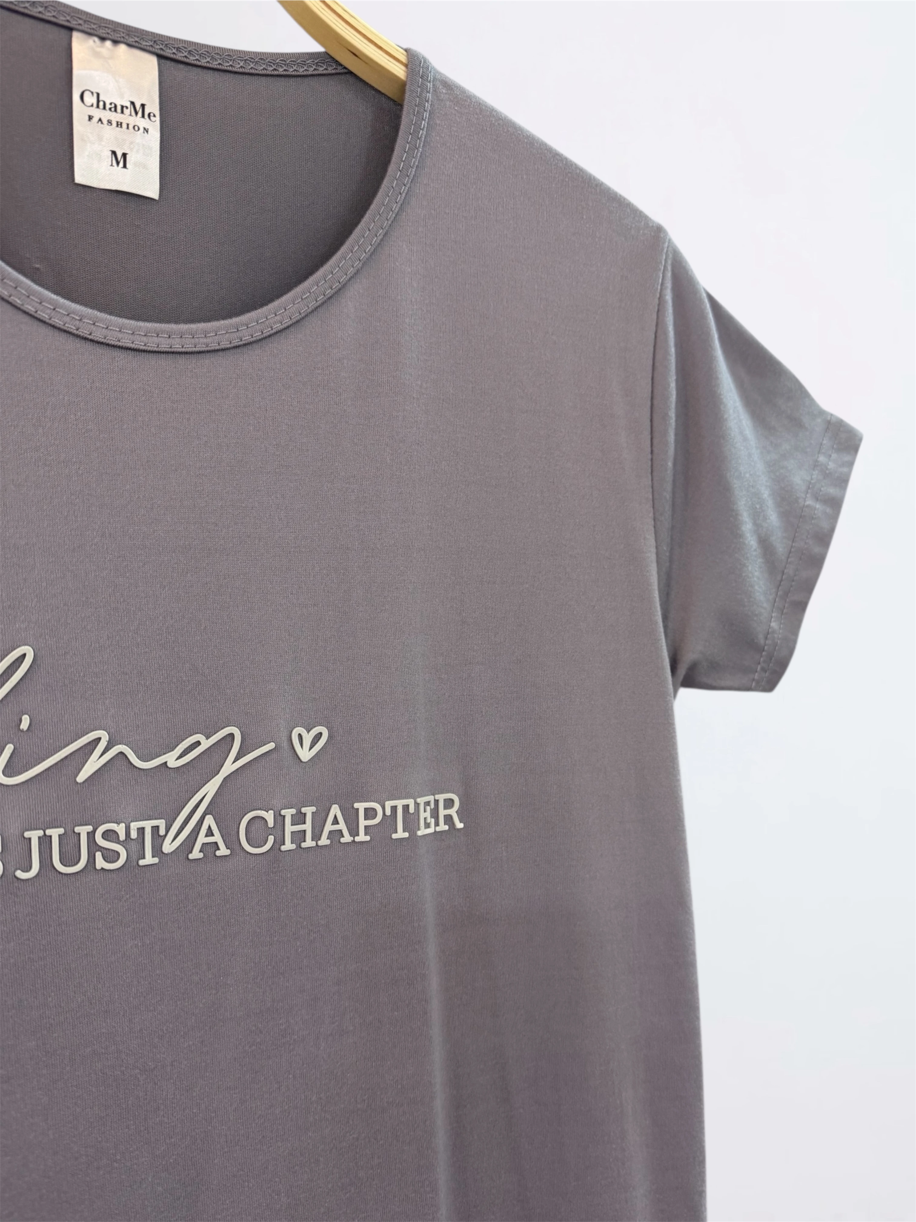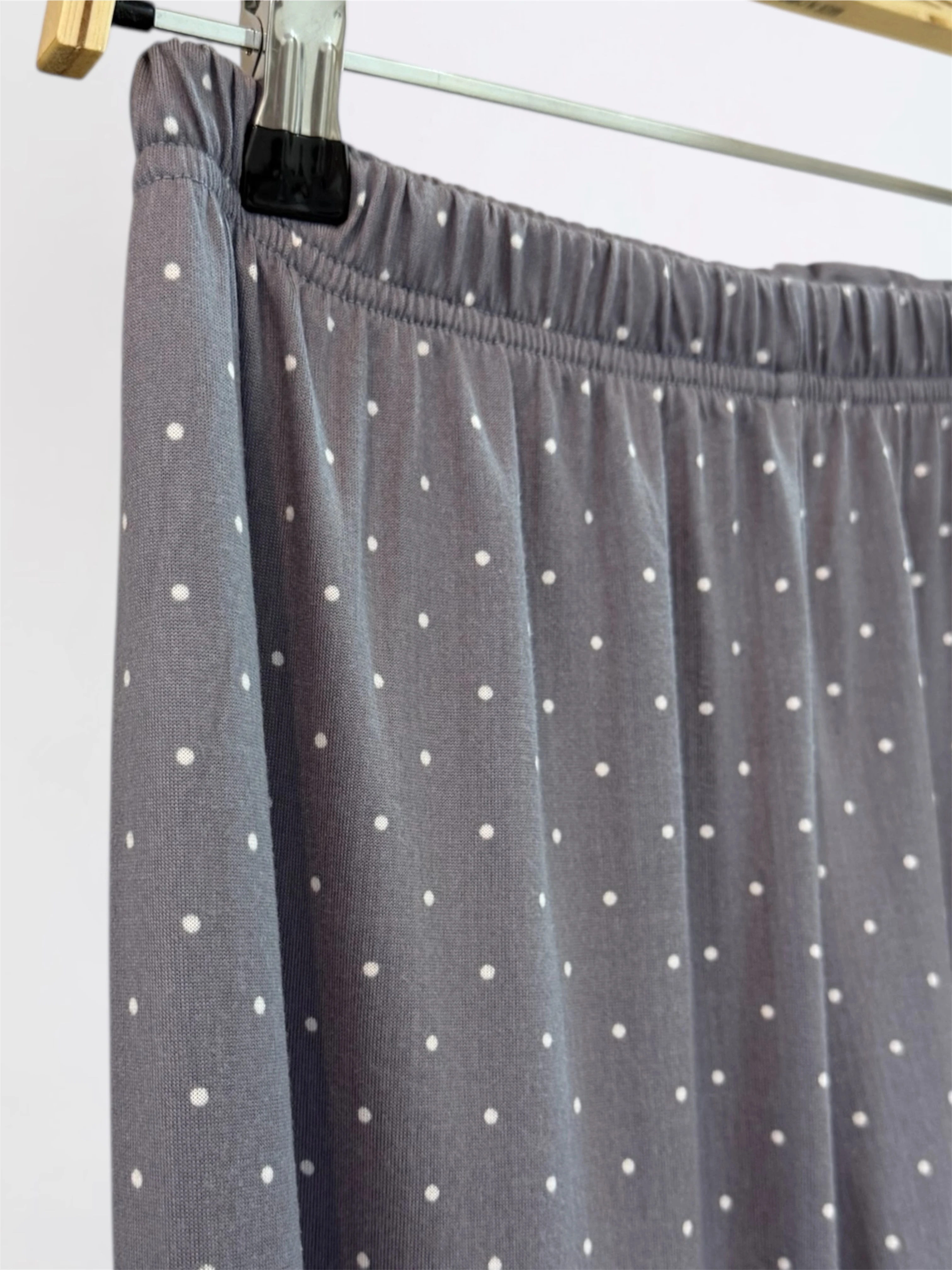 بجامة نسائية أنيقة بلون رمادي، تتكون من تيشيرت بأكمام قصيرة وبنطال طويل بنقشة ناعمة.