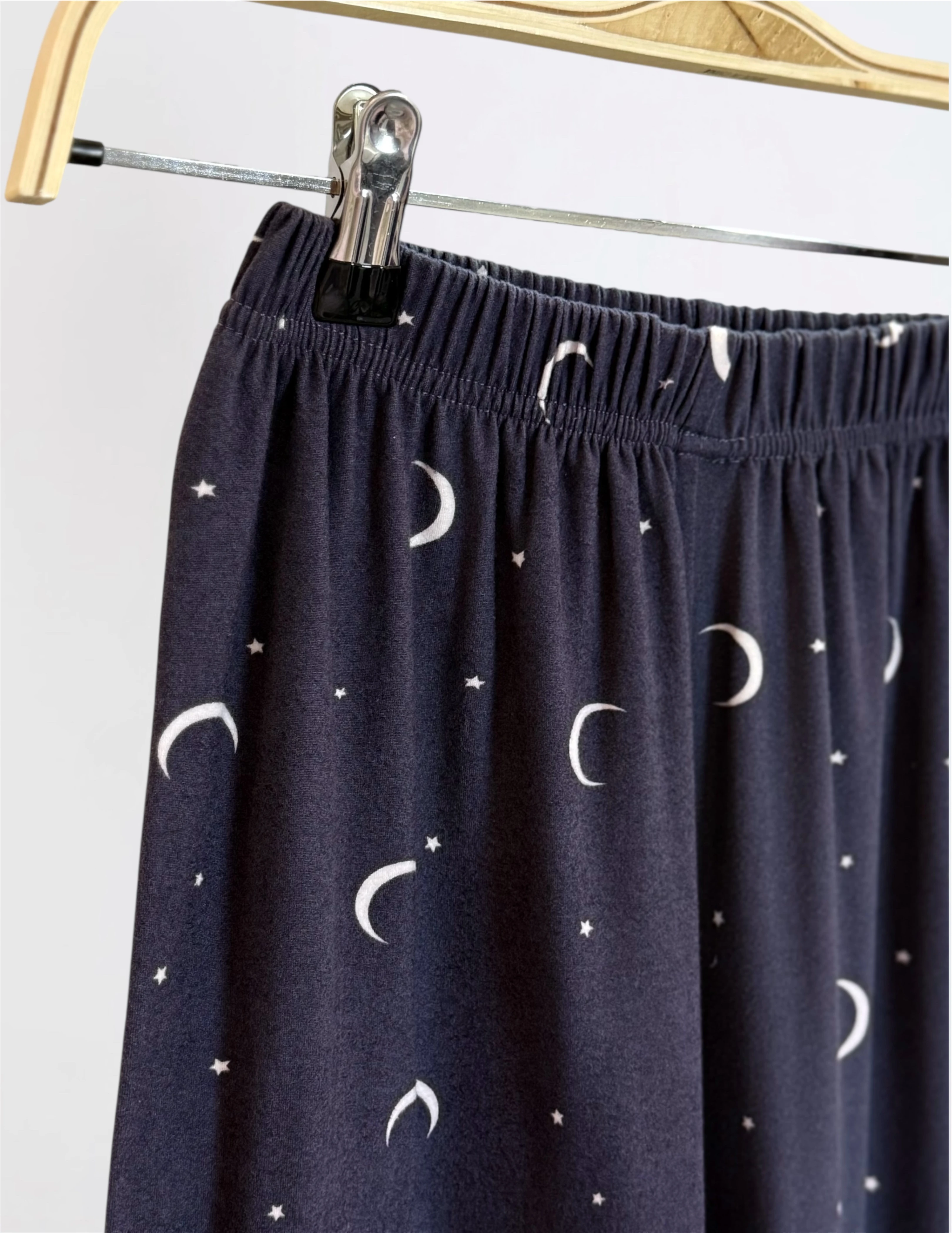 - البنطال: مزين بنقشة هلال ونجوم صغيرة موزعة بدقة، تمنح الطقم طابعًا ليليًا ساحرًا.