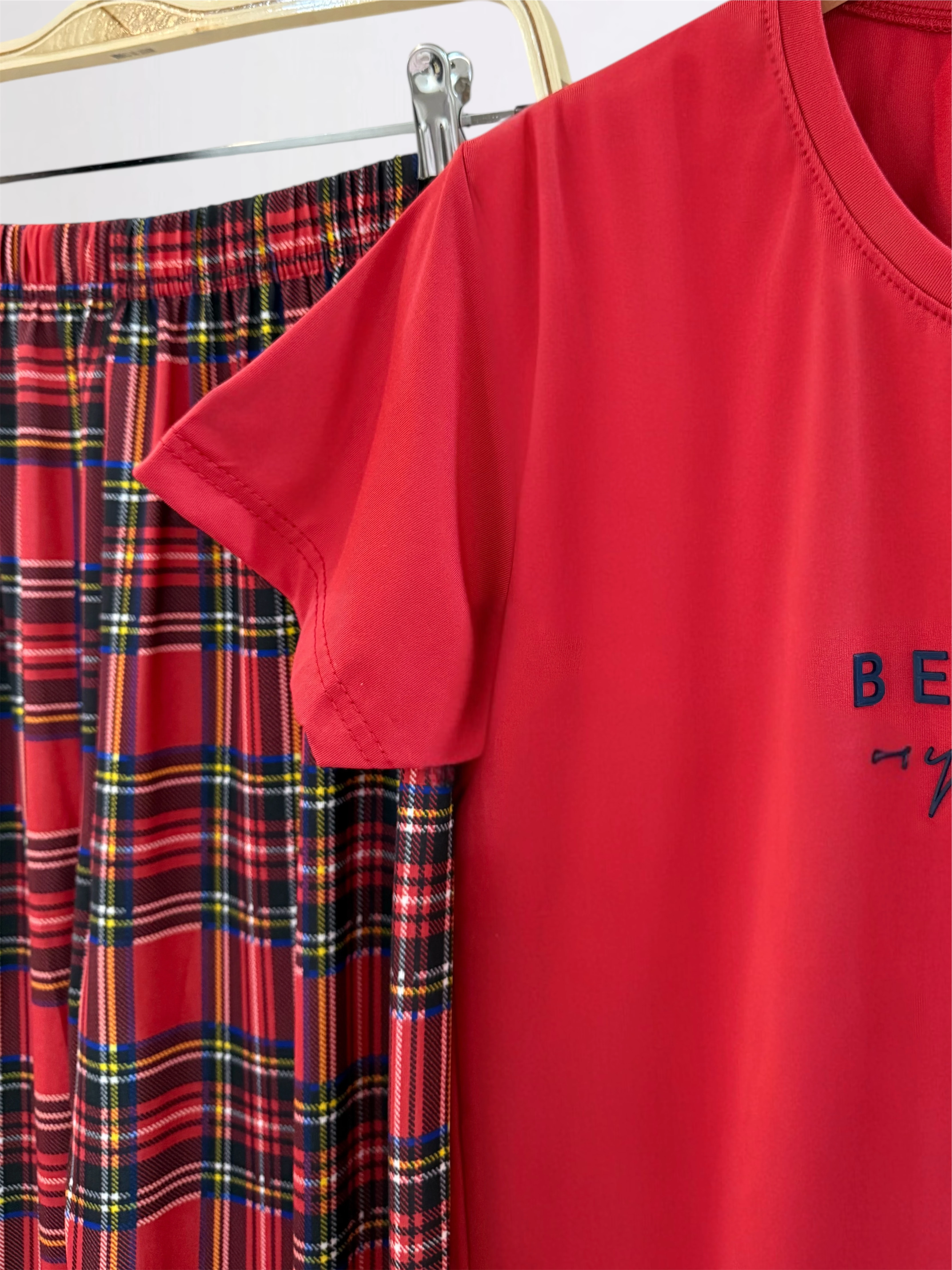 بجامة نسائية أنيقة تتكون من تيشيرت بأكمام قصيرة بلون أحمر سادة،