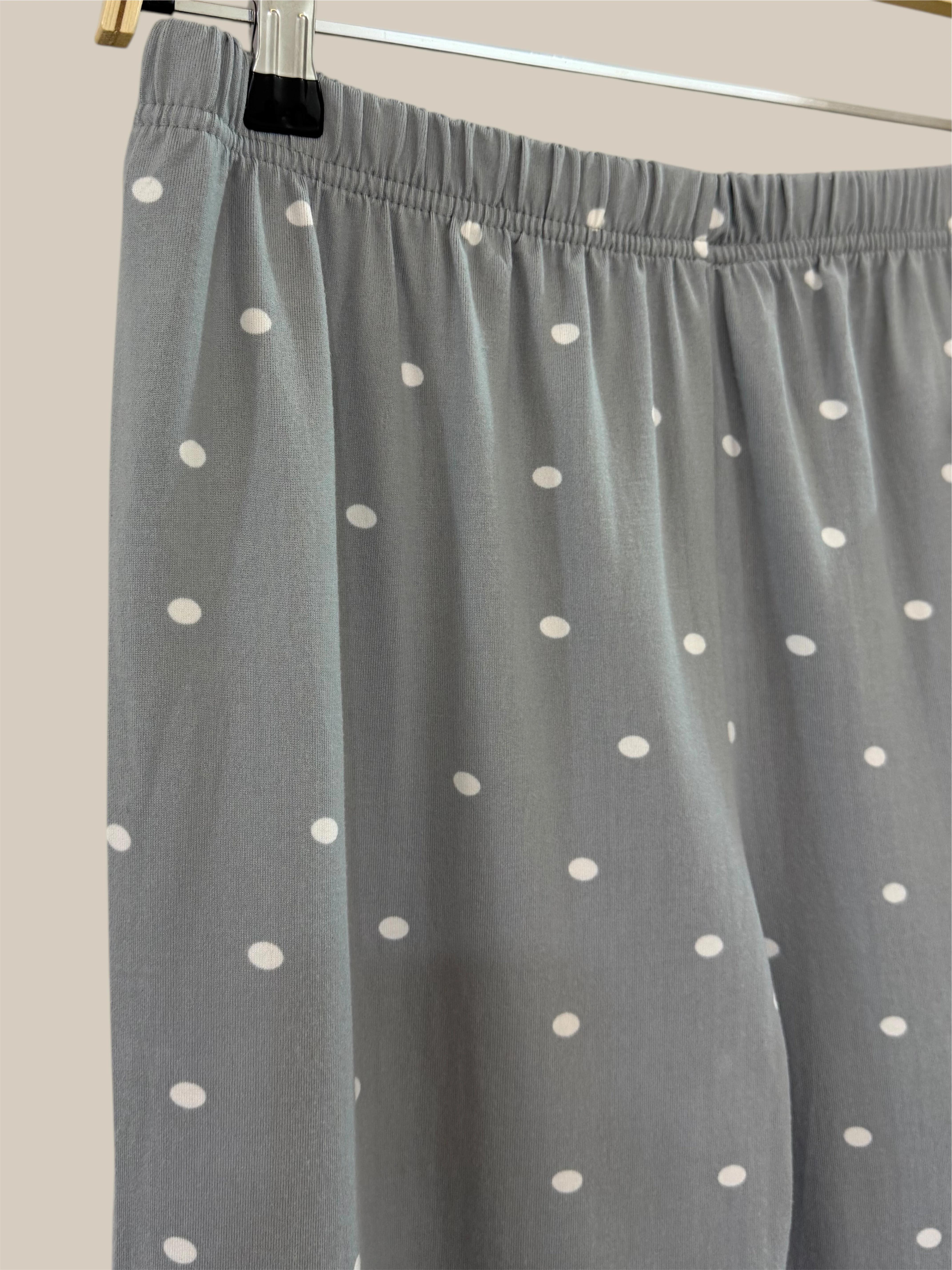 وبنطال طويل مزين بنقشة نقاط بيضاء ناعمة.