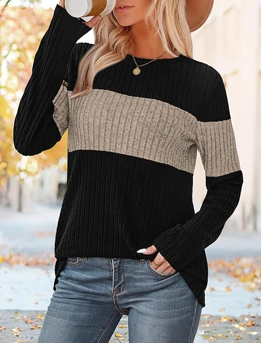 بلوفر نسائي عصري بألوان متباينة، بلوزة بأكمام طويلة، ملابس خريفية لبدايات خريف و