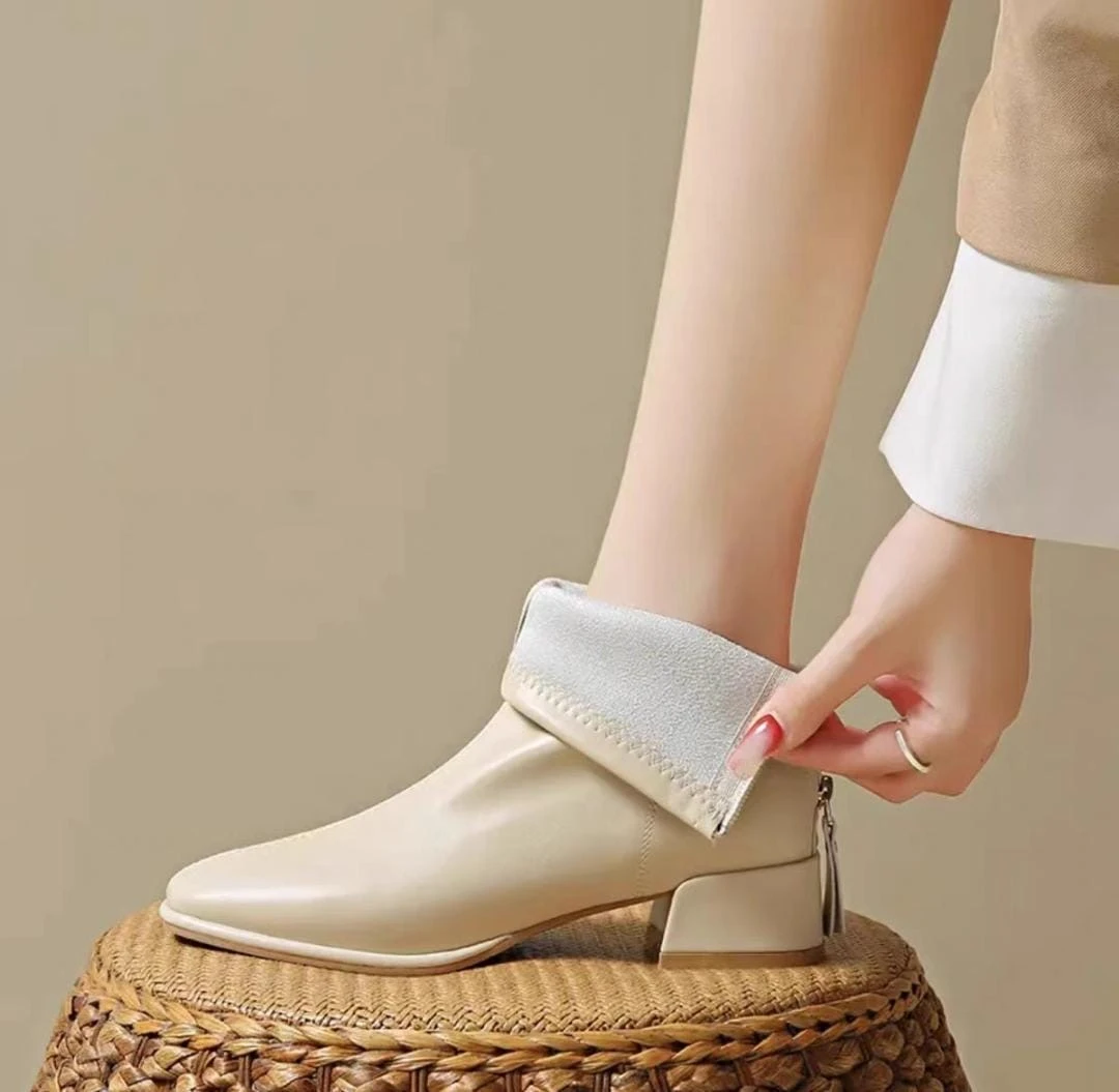 الحذاء الظاهر في الصورة هو بوت نسائي أنيق بكعب عريض متوسط الطول.