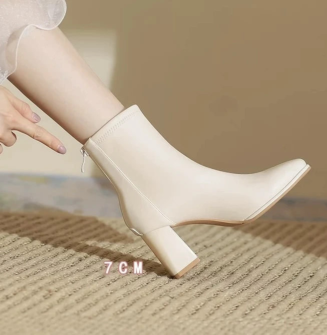 الحذاء الظاهر في الصورة هو بوت نسائي أنيق بكعب عريض متوسط الطول.