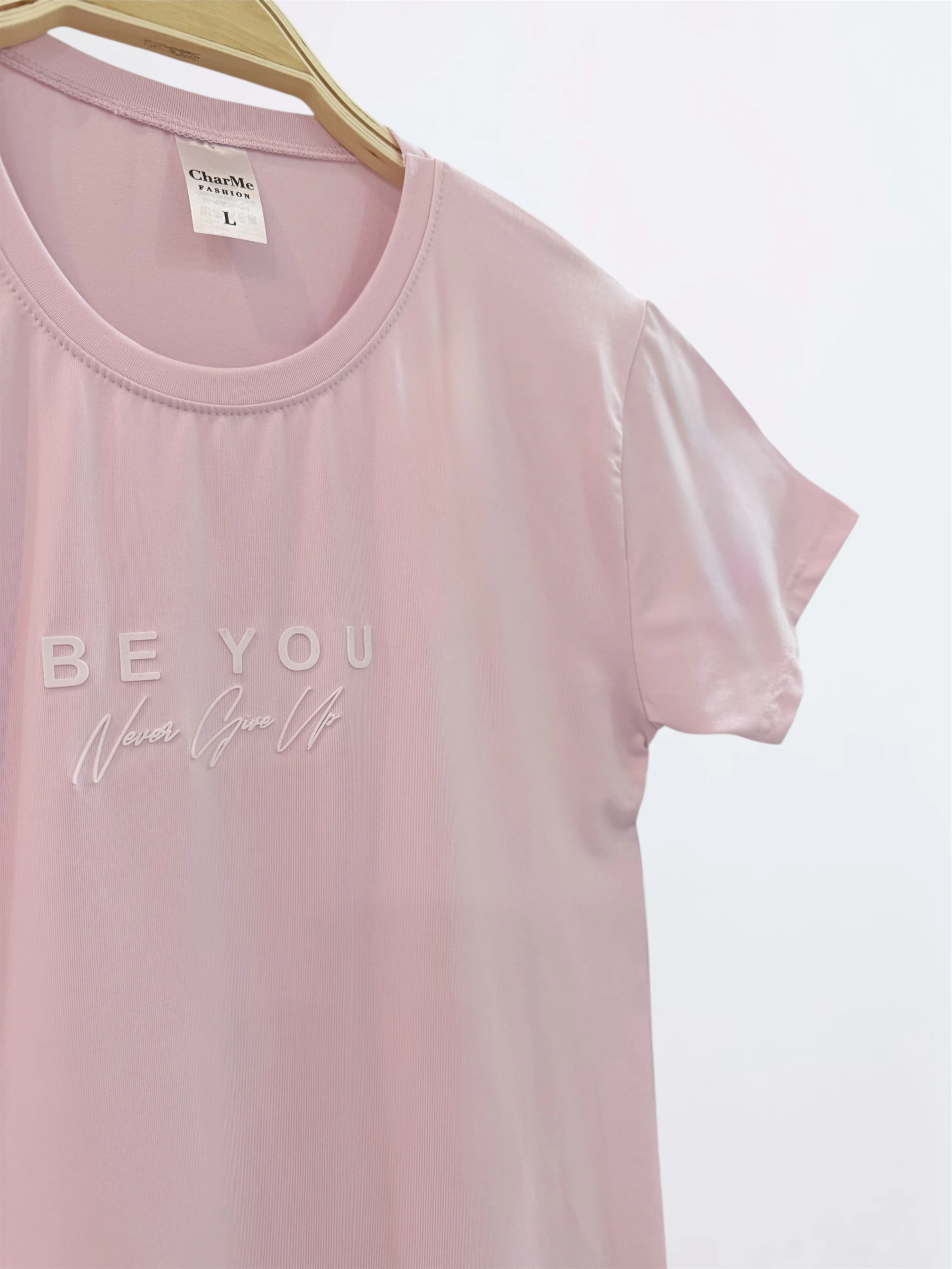 بيجامة نسائية أنيقة بلون وردي فاتح، تتكون من تيشيرت بأكمام قصيرة يحمل عبارة "BE YOU" بطباعة بيضاء،