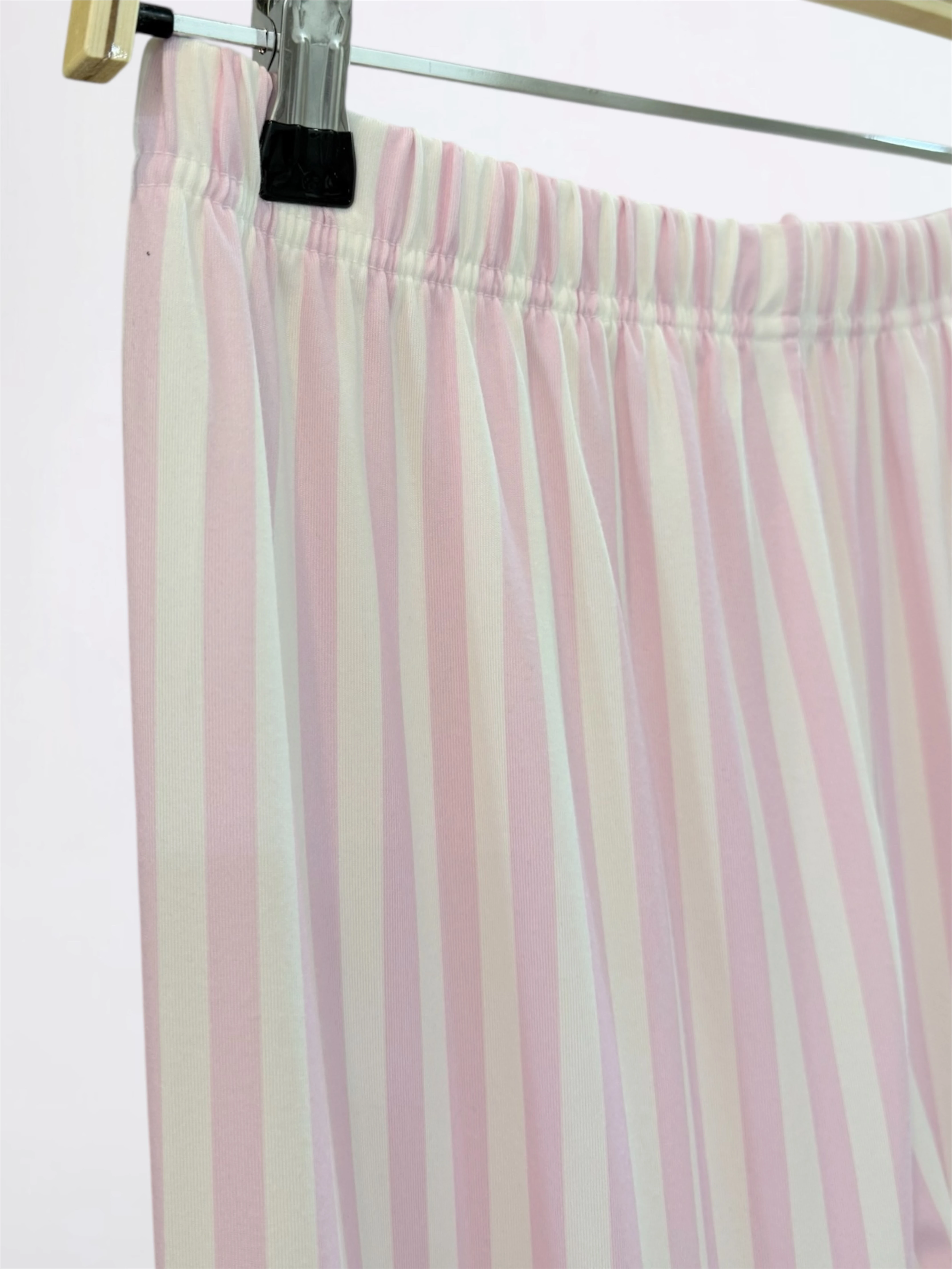 وبنطال طويل مزين بخطوط بيضاء عمودية تضيف لمسة ناعمة وعصرية.