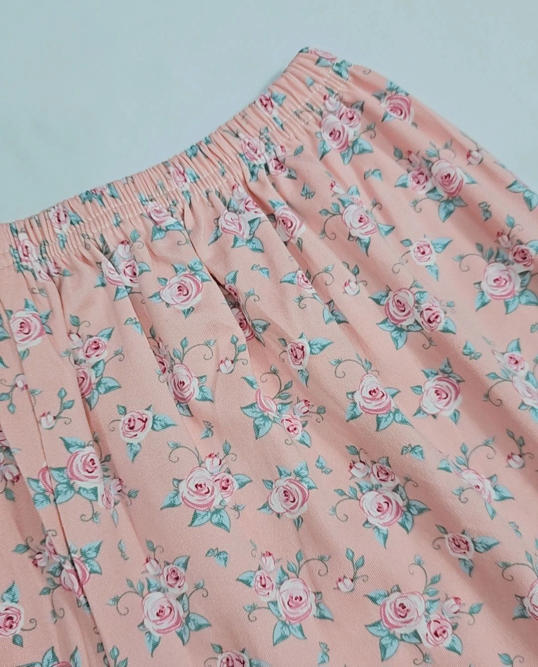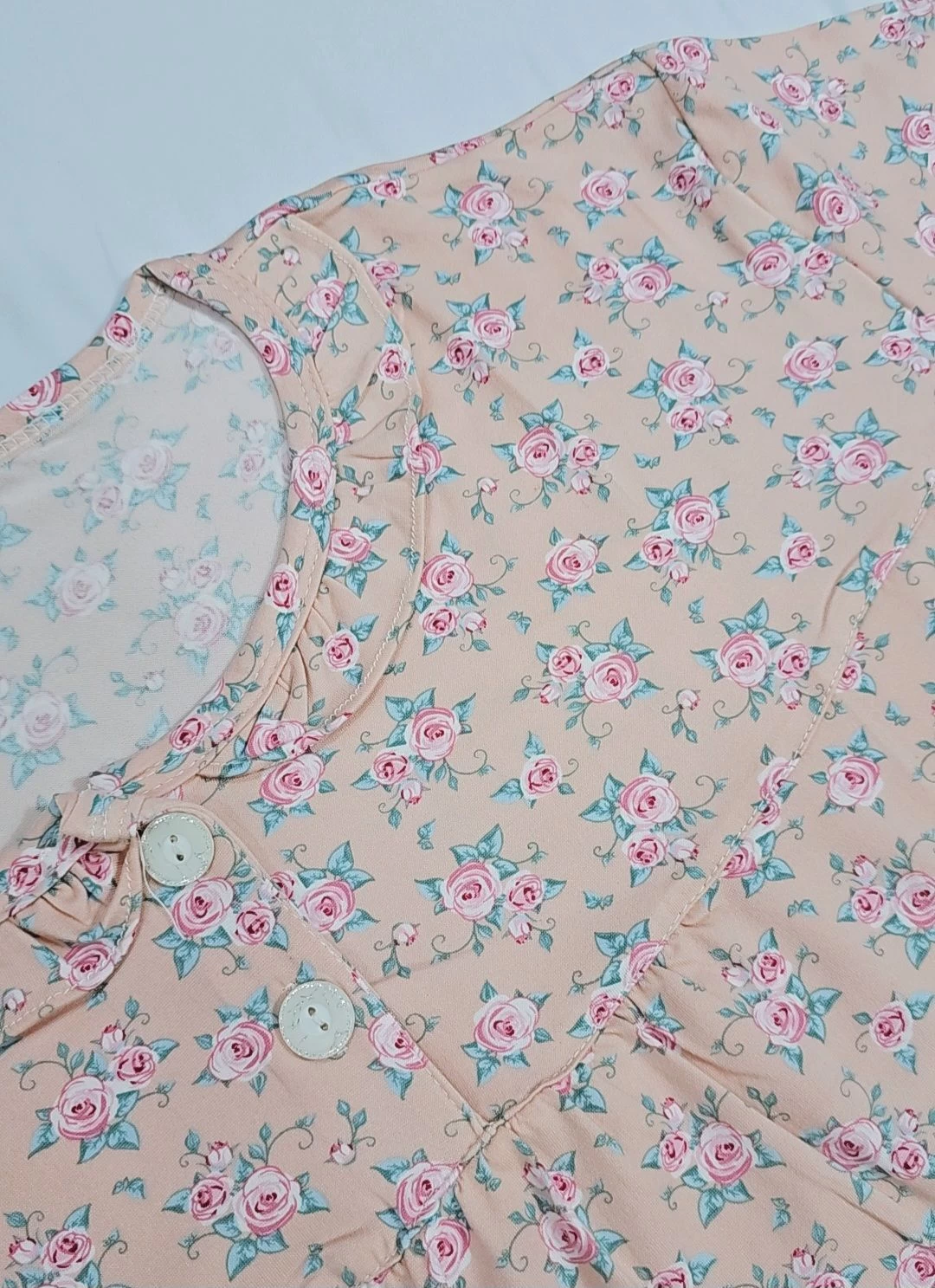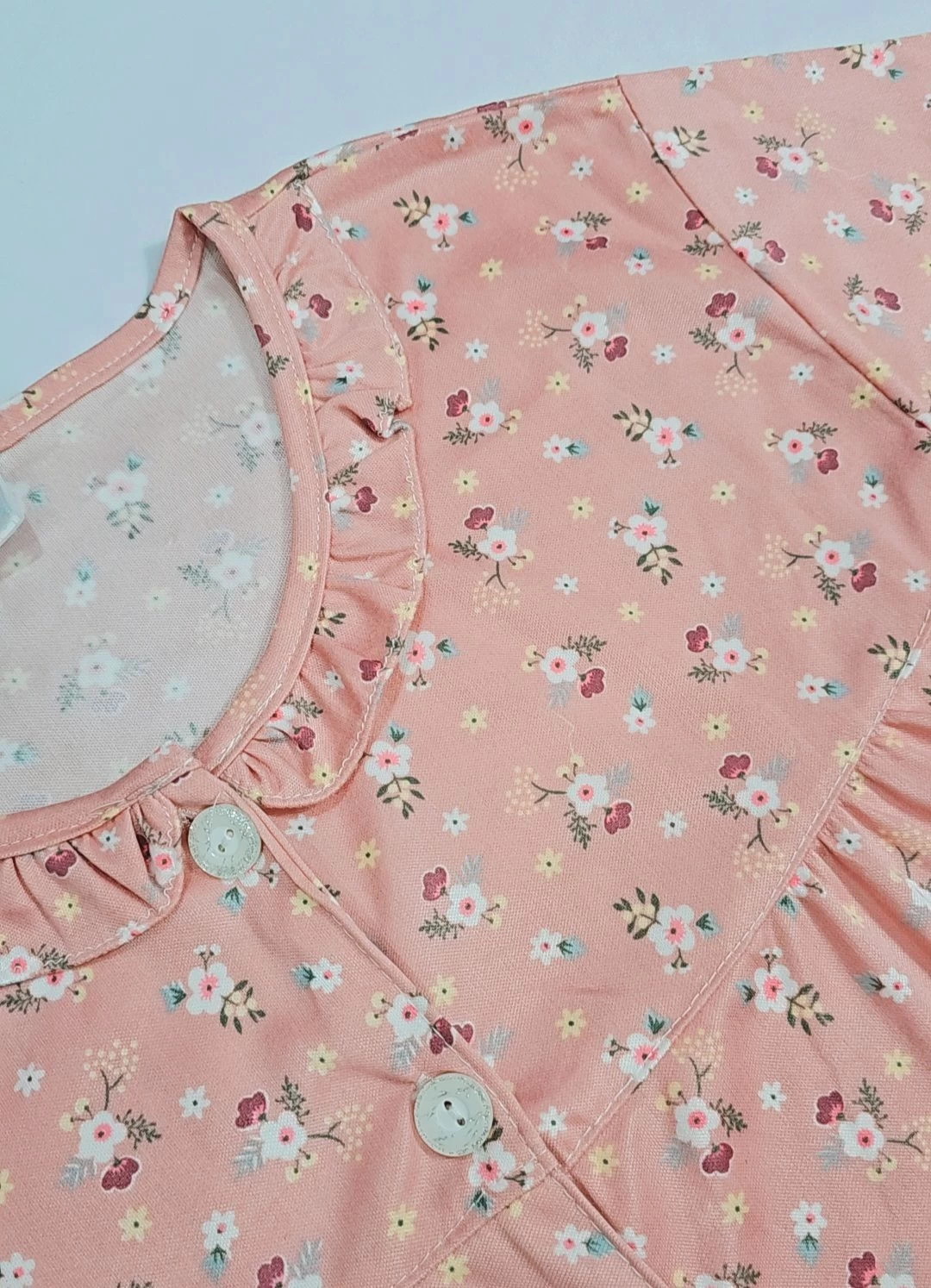 البيجاما مكونة من قطعتين وتتميز بتصميم واسع ومريح. القميص قصير الأكمام وفضفاض، مع تفاصيل كشكشة على الياقة لإضافة لمسة أنثوية وناعمة. البنطال طويل ومستقيم، مما يوفر الراحة أثناء الاستخدام. الطقم مزين بنقوش صغيرة منتشرة بشكل منتظم، مما يضفي لمسة جمالية بسيطة وأنيقة. مثالية للاسترخاء أو النوم.
