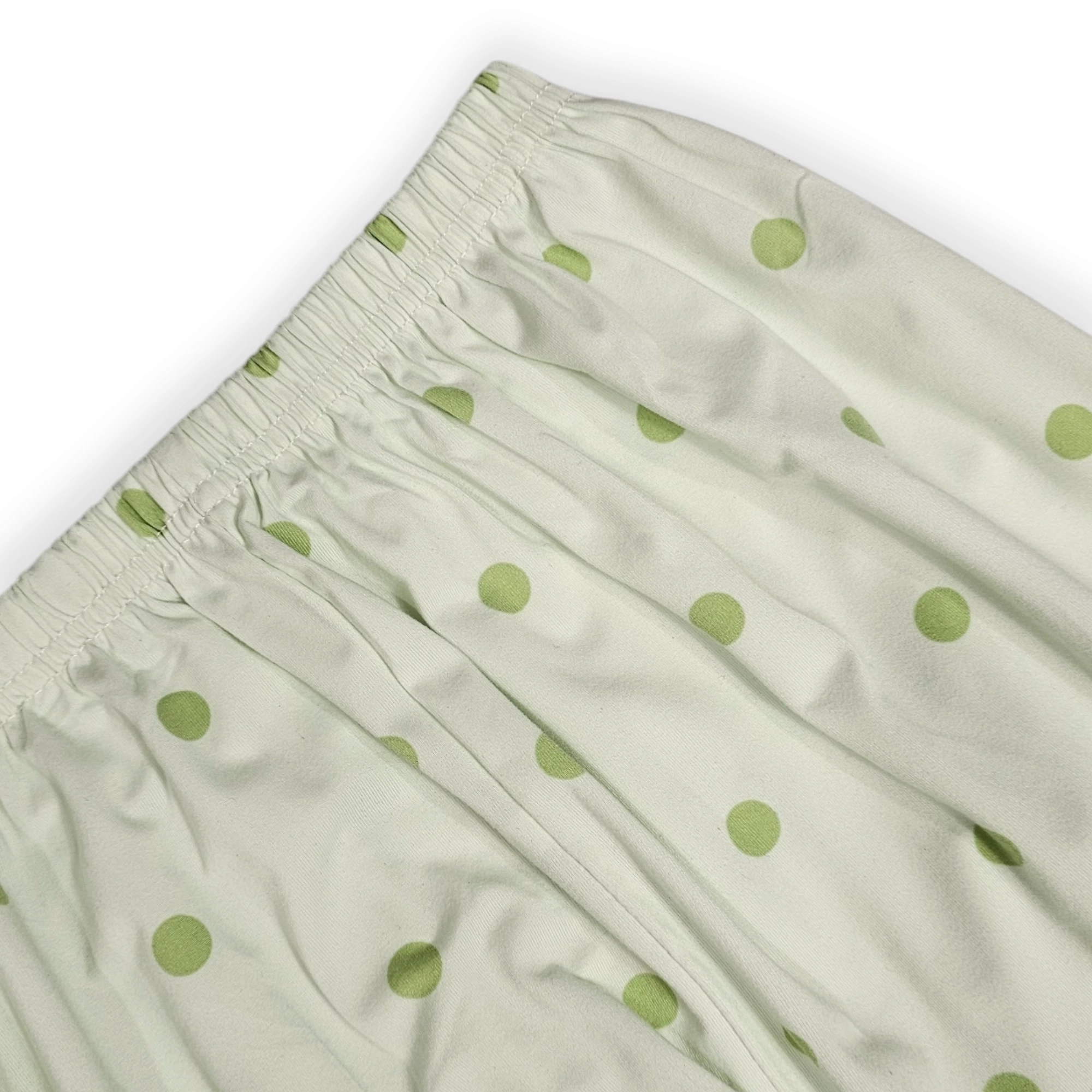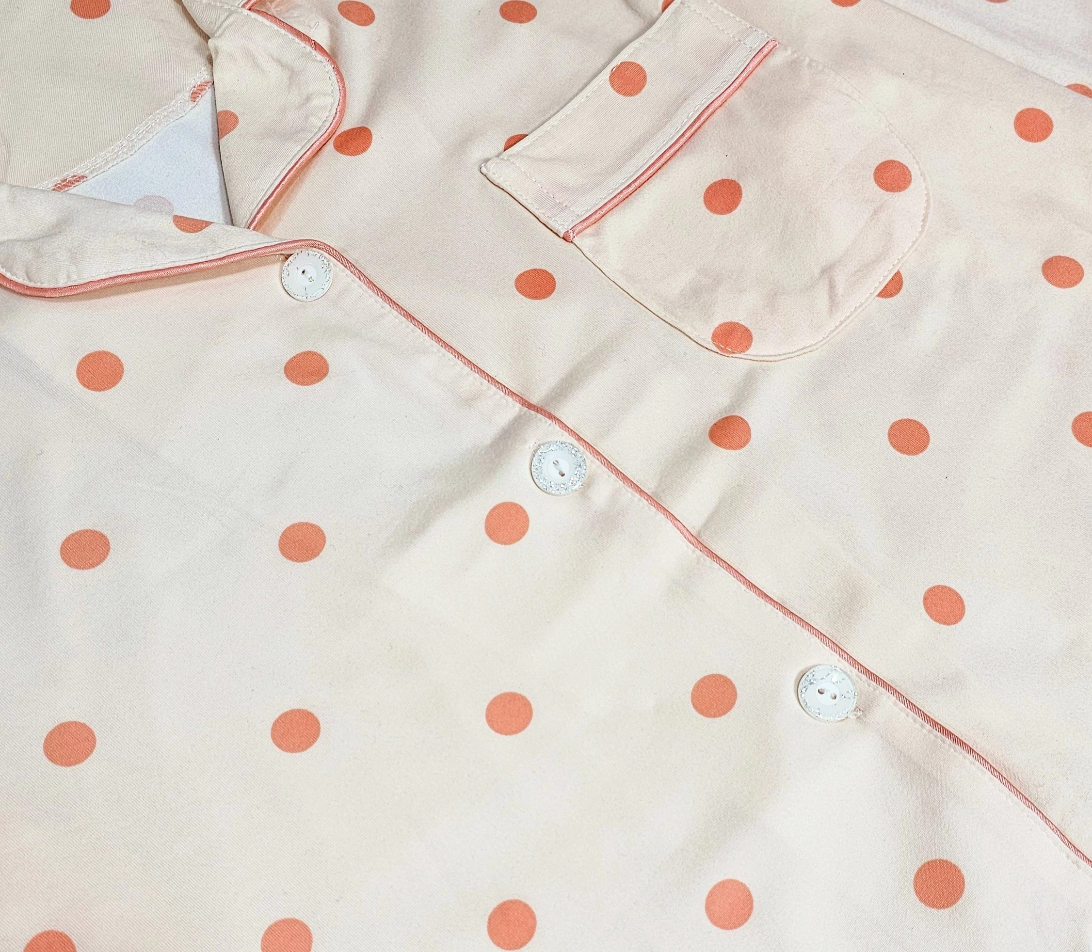 تأتي البيجامة مزينة بنقشة بولكا المميزة التي تضيف لمسة أنثوية ومرحة.