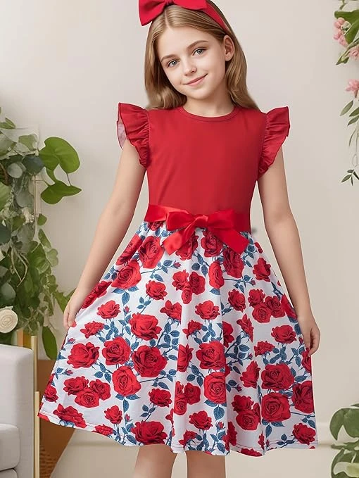فساتين كاجوال بقصة ايه لاين وقبة دائرية ضيقة وأكمام مرفرفة للصيف والعطلات للبنات مع حزام لعمر 10-14 سنة
