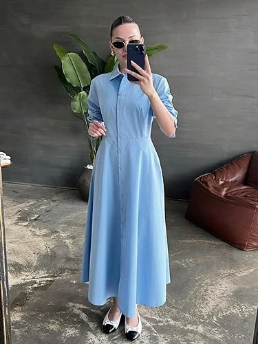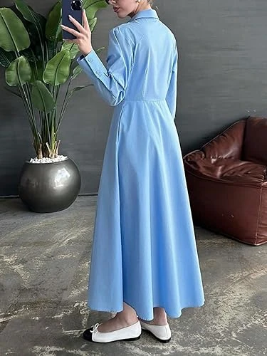 فستان كلاسيكي بتصميم قميص للنساء - فستان ماكسي بأكمام طويلة مع زر أمامي وتصميم ي
