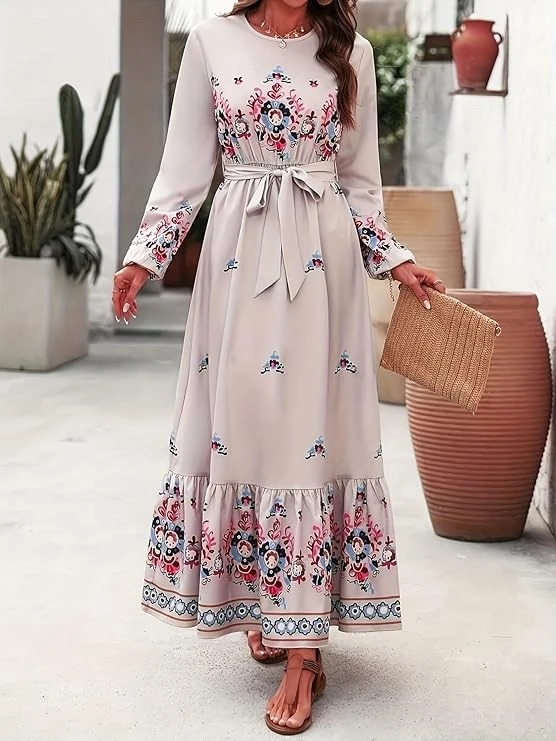 فستان ماكسي كاجوال بأكمام طويلة وقبة V بطبعة زهور للنساء من الخريف