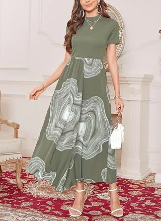 • المزايا: رقبة دائرية، كم قصير، خصر مرتفع مطاطي. تصميم فستان ماكسي أنيق عالي الخصر يمكن أن يبسط محيط خصرك، والخصر المرن يمكن أن يناسب خصرك بشكل أفضل، لا داعي للقلق بشأن مقاس الفستان الطويل الكاجوال الذي لا يناسبك.