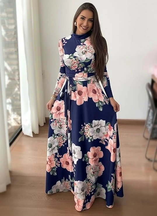 فستان ماكسي للنساء بطبعة زهور، فساتين طويلة كاجوال بوهيمية ذات ثنيات مع حزام