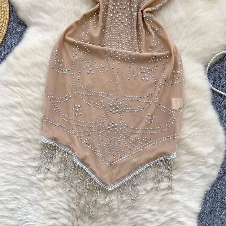 مع إضافة شراشيب كريستالية متدلية من الصدر وحواف التنورة
