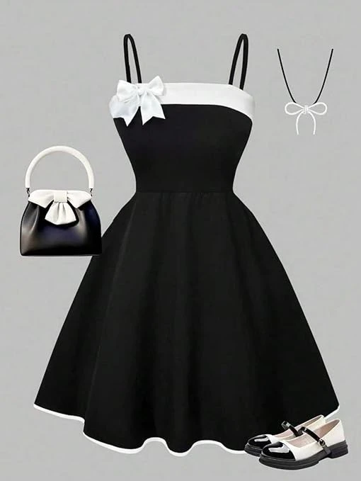 فستان صيفي أنيق وعصري للبنات، فستان بسيط باللونين الأسود والأبيض مع حزام كتف وفيونكة
