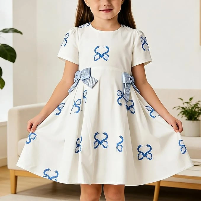 فستان صيفي كاجوال بقصة ايه لاين وأكمام منتفخة قصيرة وطبعة عقدة فيونكة خفيف الوزن ومتعدد الاستخدامات للارتداء اليومي والحفلات للبنات بعمر 4-7 سنوات