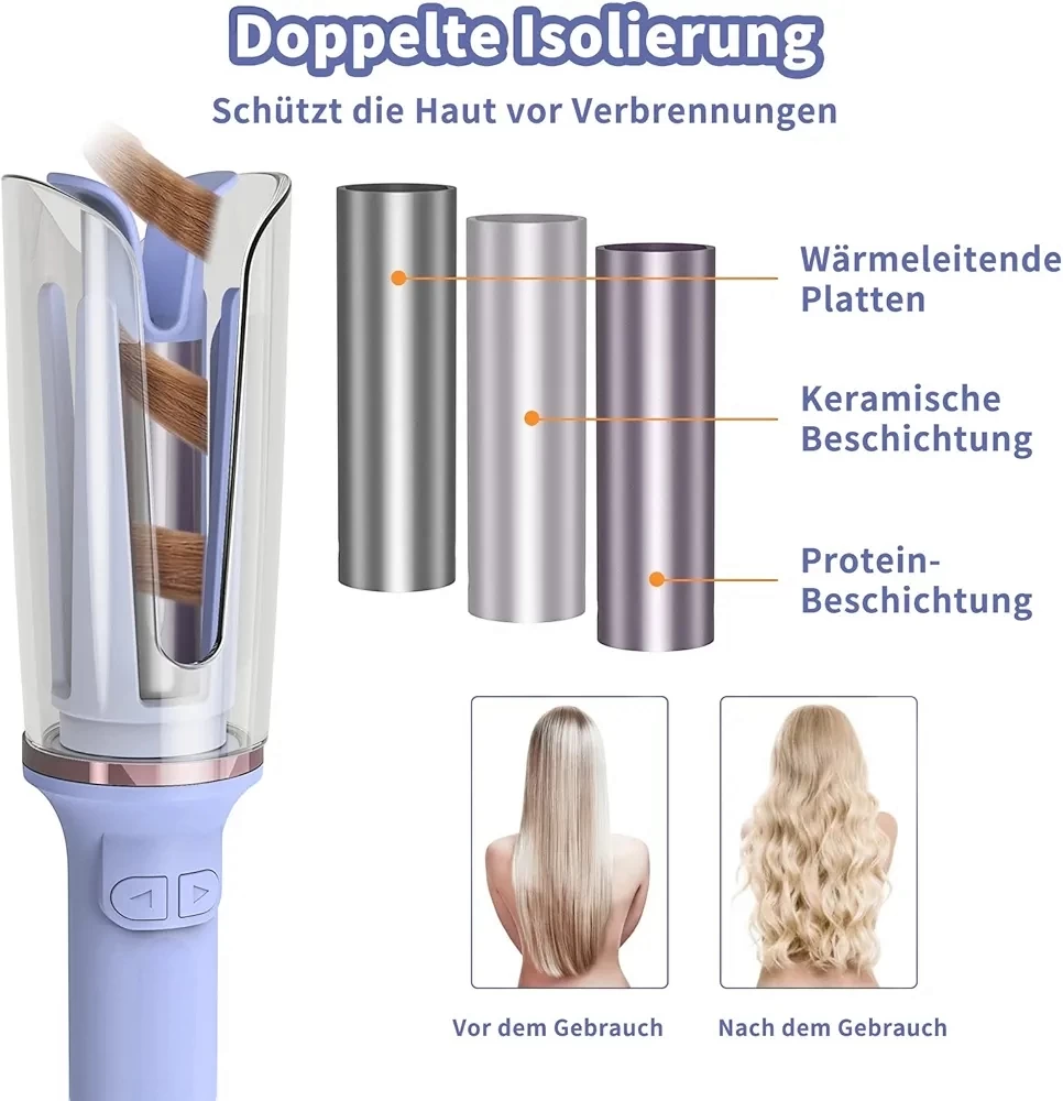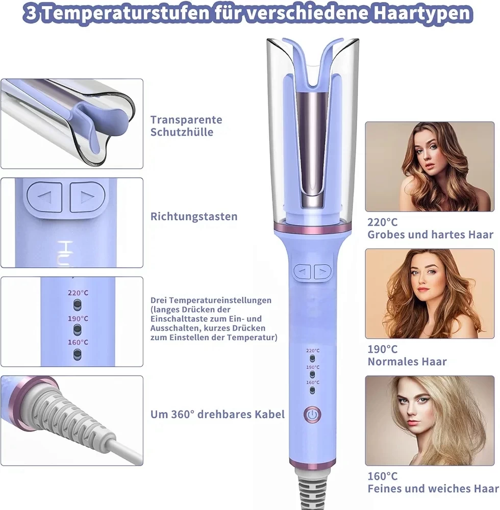 إعدادات درجات الحرارة**: يتميز الجهاز بثلاث إعدادات لدرجة الحرارة تناسب جميع أنواع الشعر: - **220 درجة مئوية** للشعر الخشن والسميك. - **190 درجة مئوية** للشعر العادي. - **160 درجة مئوية** للشعر الناعم والرقيق. - **ميزات التحكم**: يتضمن غطاءً شفافًا للحماية، وأزرارًا للتحكم في الاتجاه، وكابل دوار بزاوية 360 درجة. يمكن تغيير درجات الحرارة عن طريق الضغط المطول على زر التشغيل والإيقاف، والضغط القصير لضبط درجة الحرارة المطلوبة. الميزات الإضافية: - **تقنية العزل المزدوج**: توفر حماية إضافية للبشرة من الحروق. - **عناصر التسخين الثلاثية**: - طبقة ناقلة للحرارة لتوزيع الحرارة بشكل متساوٍ. - طبقة خزفية لحماية الشعر وتقليل التلف. - طبقة بروتينية لمنح الشعر لمعانًا ومرونة. الأمان والتقنيات المتقدمة: - **المستشعرات الذكية**: يقوم الجهاز بإبطاء نفسه تلقائيًا عند اكتشاف كمية كبيرة من الشعر المتشابك، مما يجعله أكثر أمانًا وسهولة في الاستخدام مقارنة بالأجهزة التقليدية. - **إجراءات الأمان**: في حالة حدوث انسداد بسبب كثرة الشعر، يُنصح بإطلاق زر التجعيد فورًا وإزالة الشعر من الجهاز. الجهاز يعتبر خيارًا ممتازًا لمن يبحث عن أداة تجعيد شعر آمنة وفعالة.