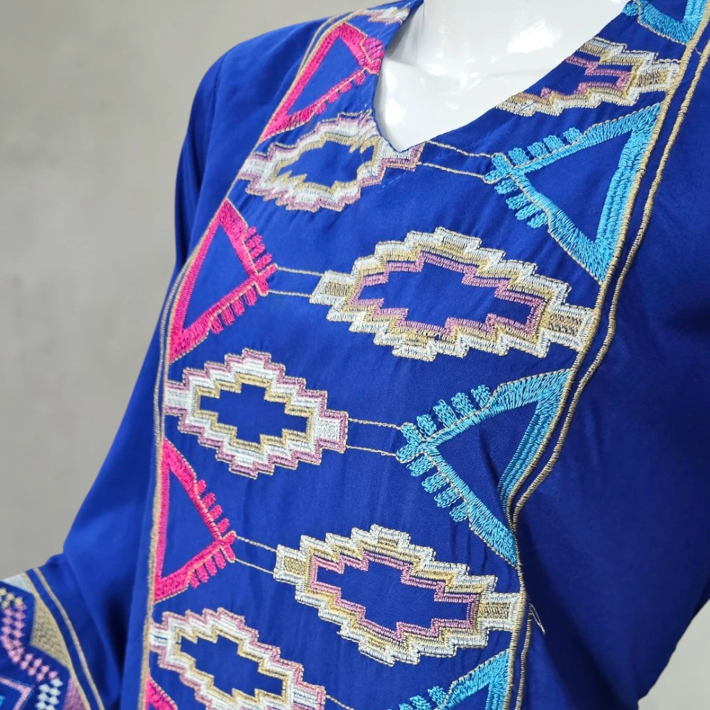 تحتوي على تطريز هندسي يمتد على طول الجزء الأمامي،