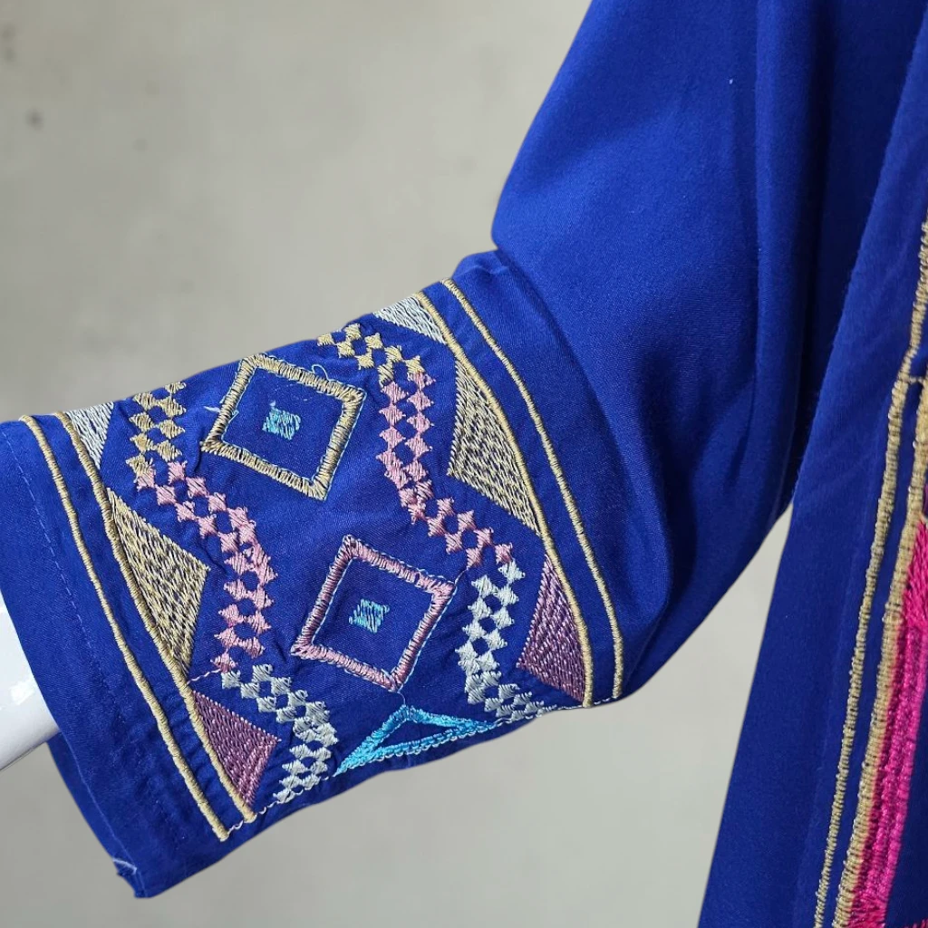 الأكمام مزينة أيضًا بتطريز مماثل، ما يمنحها مظهراً أنيقاً.