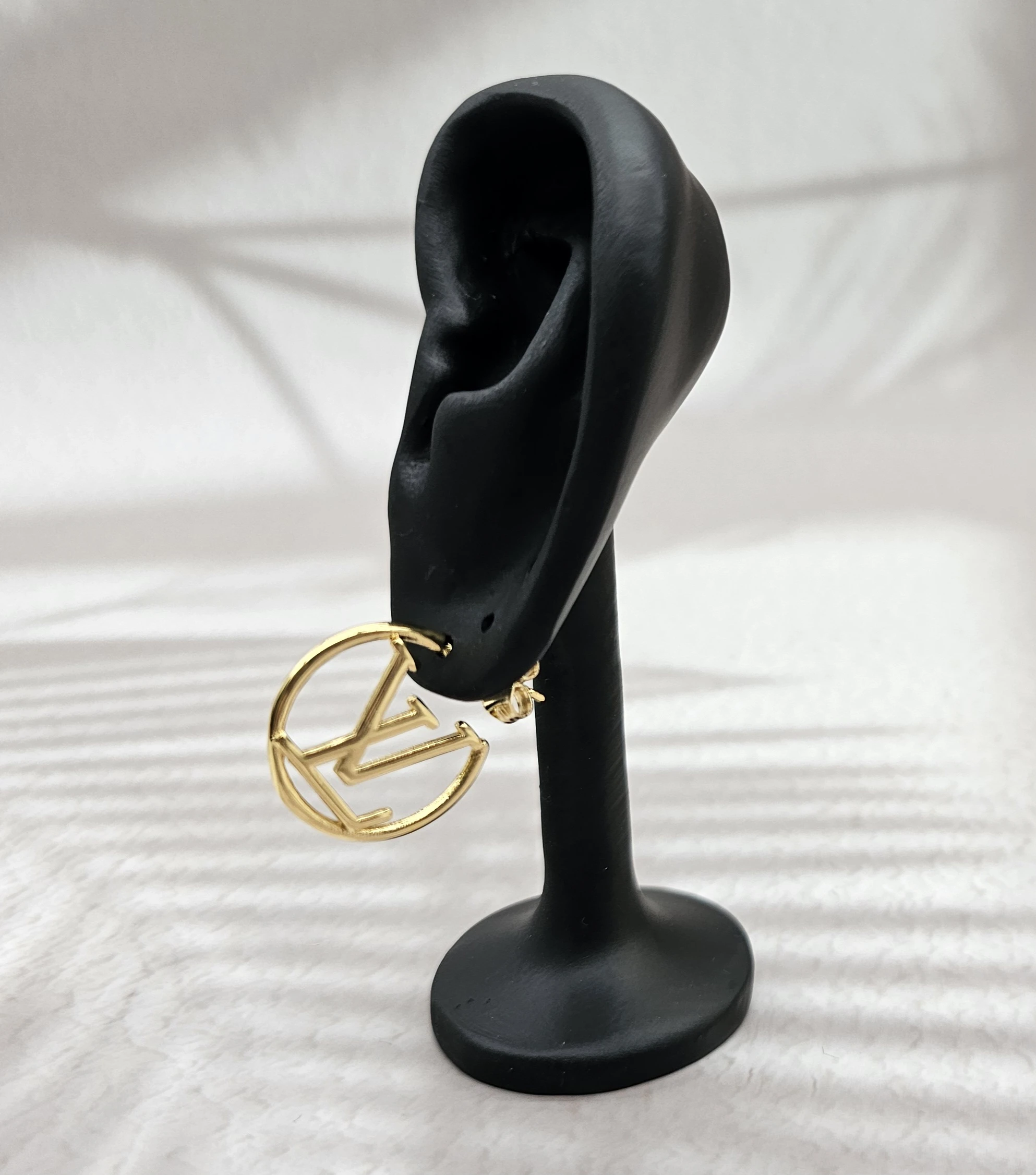 الحلق عبارة عن زوج من الأقراط الذهبية الدائرية التي تحتوي على شعار LV في منتصفها.