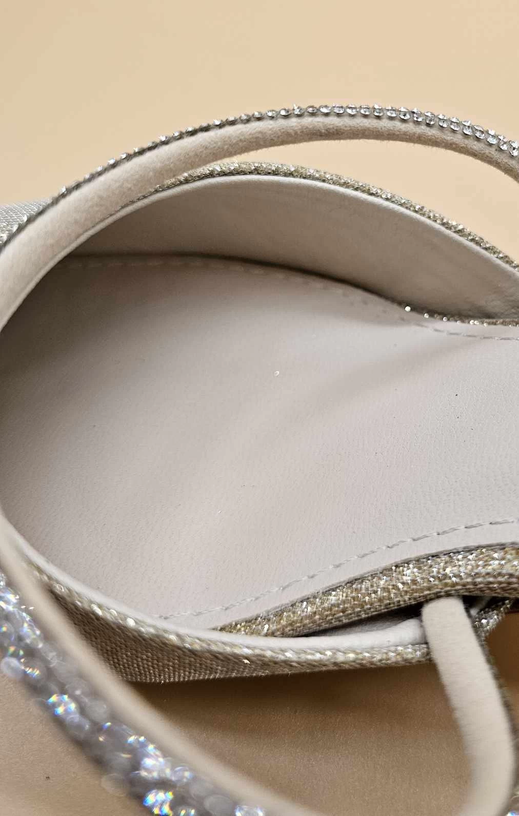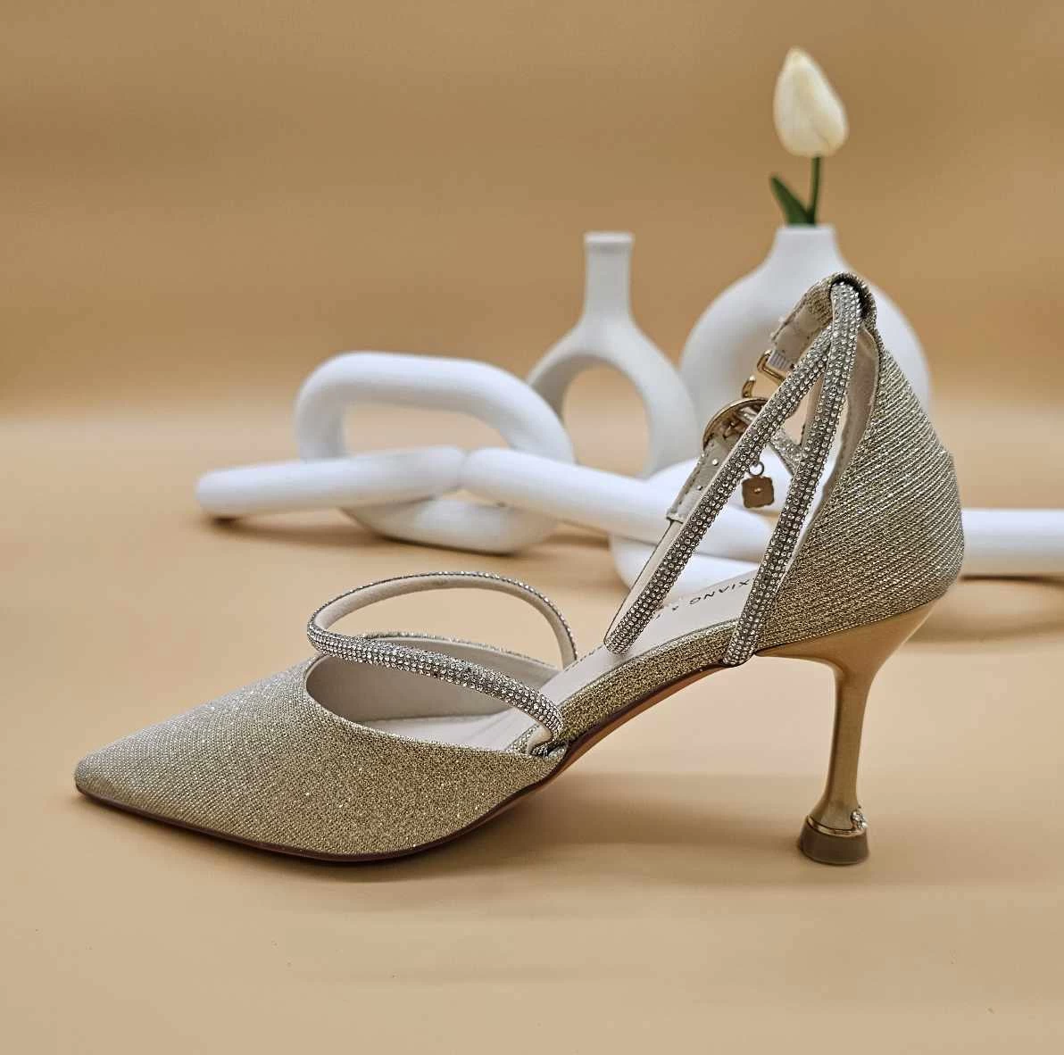 حذاء بكعب عالي رفيع بإصبع مدبب للنساء بتصميم خلخال على الكاحل باللون الذهبي للزفاف أو الحفلات أو المناسبات