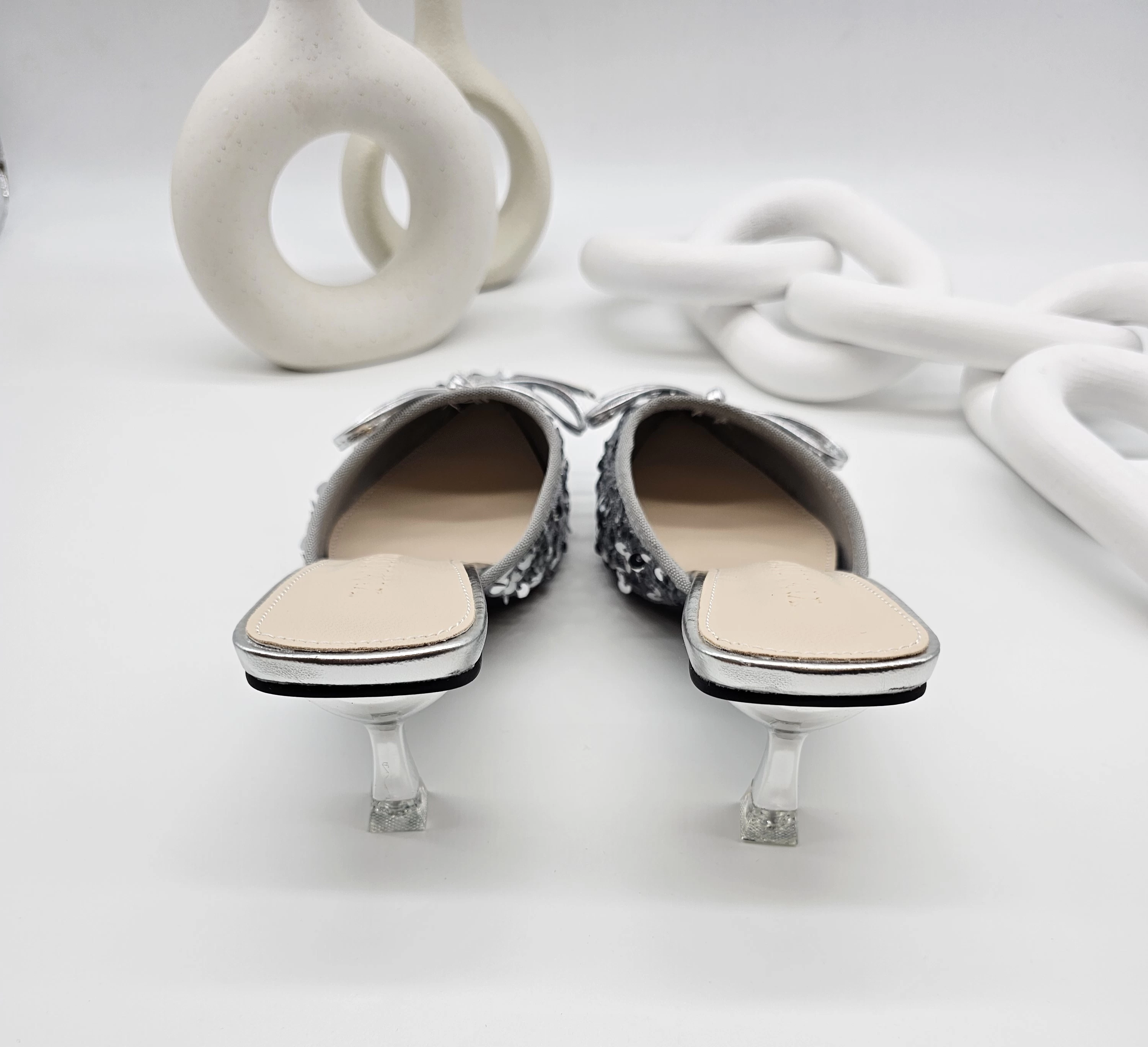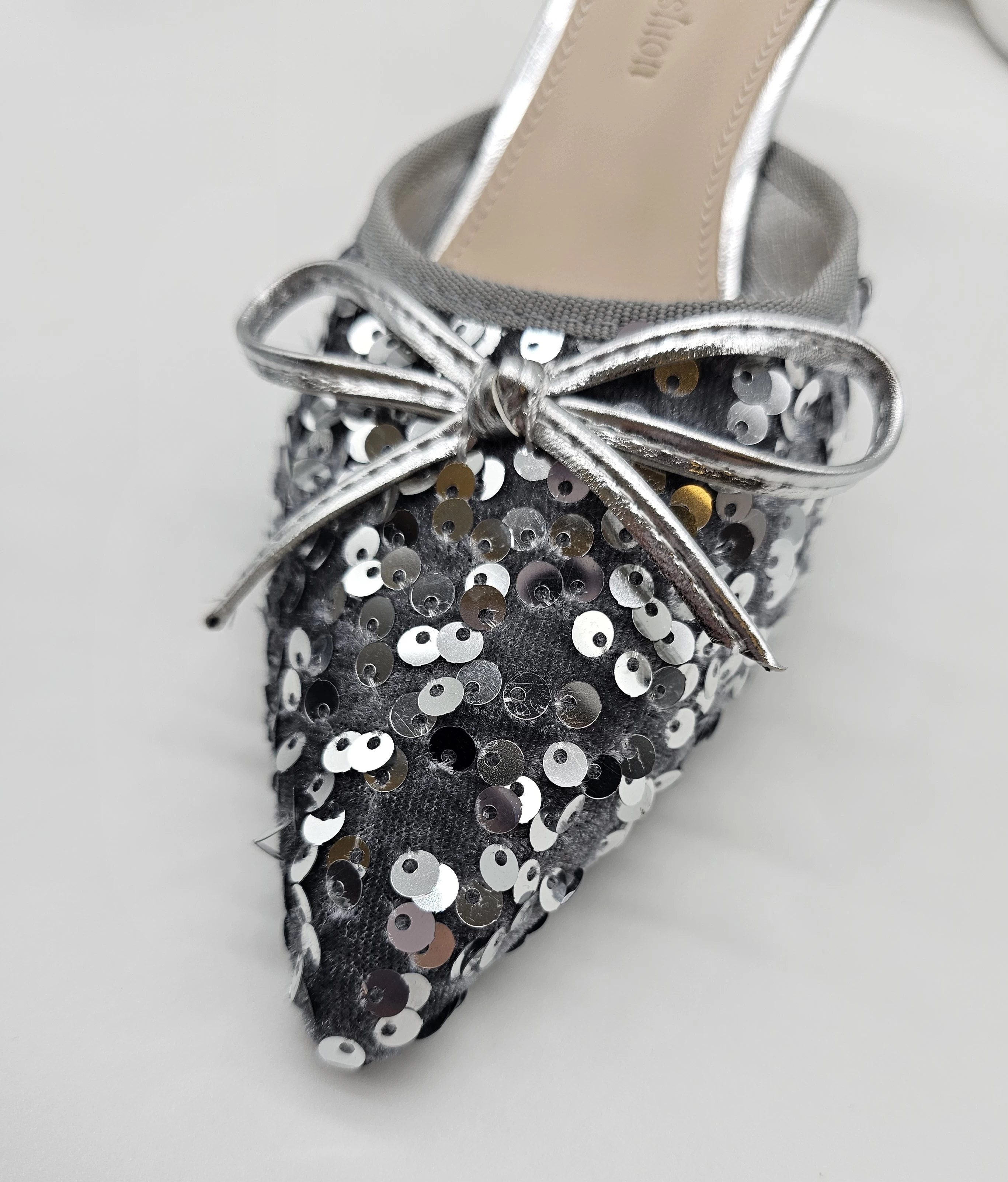 حذاء بكعب عالي للنساء بلمعه و مدبب من الامام ومفتوح من الخلف مناسب للحفلات والمناسبات باللون الفضي